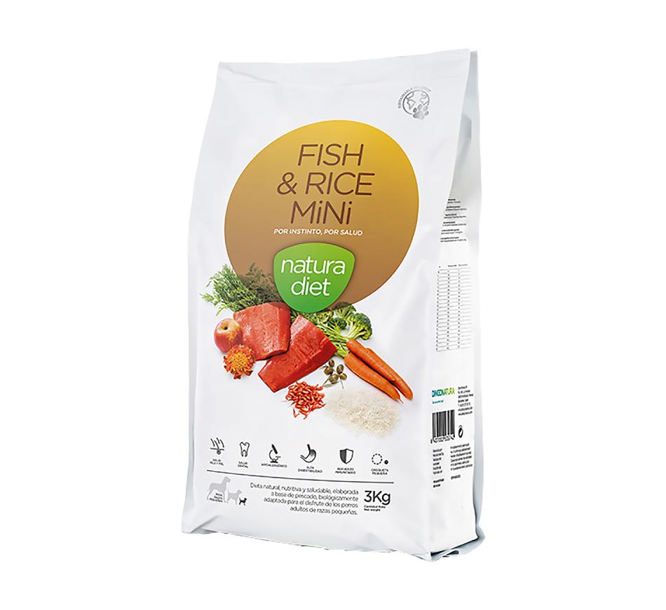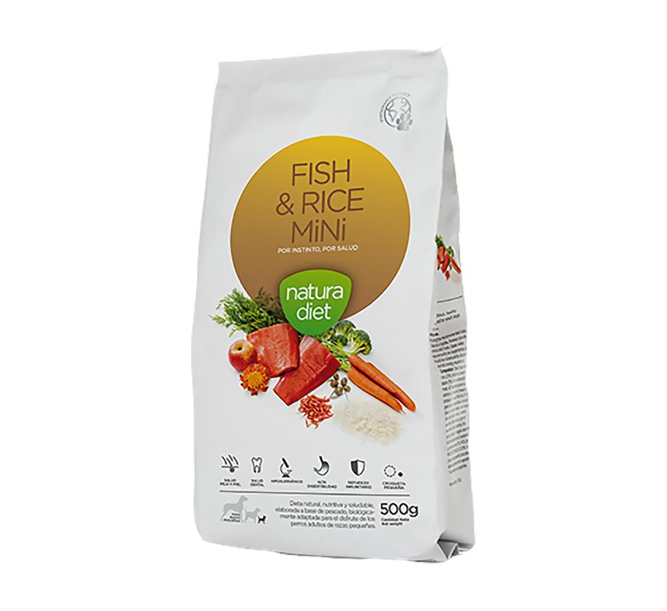 Natura Diet Cão Peixe & Arroz Mini de Pescado es una dieta natural, nutritiva y saludable, elaborada a base de pescado, biológicamente adaptada para perros adultos de cualquier raza y tamaño pequeño. Fish & Rice Mini es altamente digerible, elaborado con ingredientes naturales con capacidad alergénica reducida o nula.
