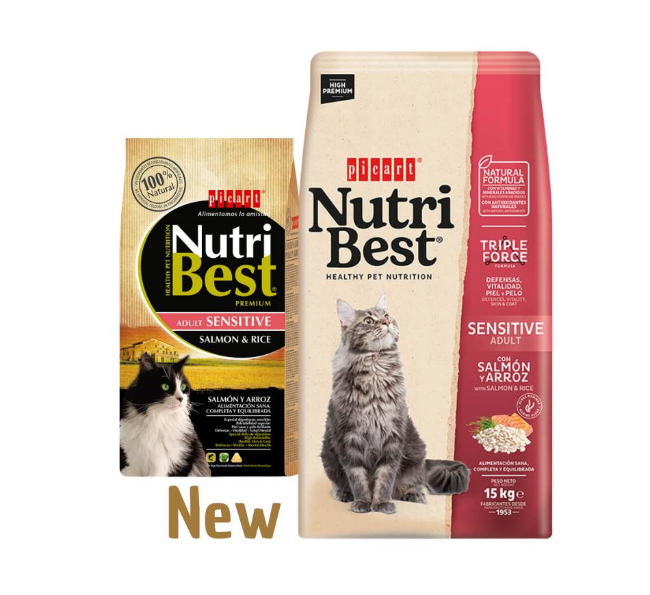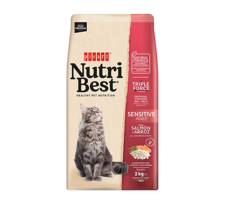 Nutribest Cat Adult Sensitive con salmón y arroz es un pienso completo para gatos adultos con sensibilidad alimentaria. Este alimento contribuye a un sistema inmunológico más fuerte y a una mayor vitalidad, favoreciendo también la salud mental e intestinal y la salud de la piel y el pelaje. Además, apoya las funciones cardíacas y oculares y promueve la salud urinaria.