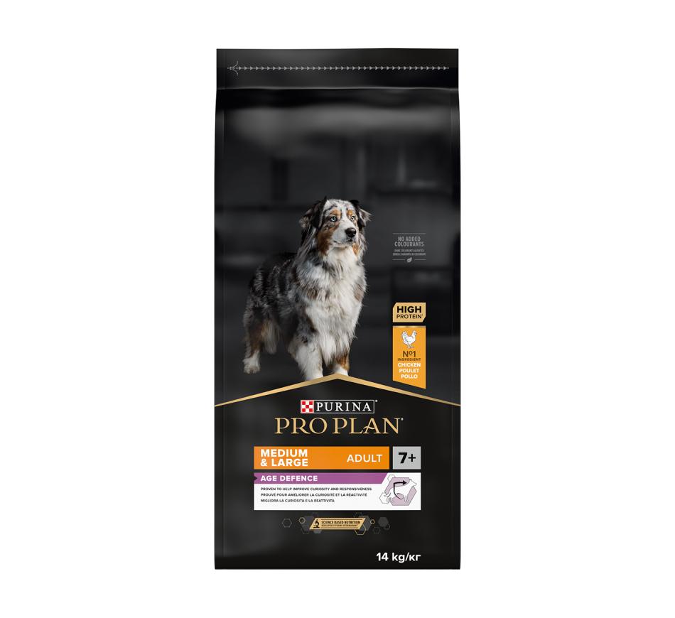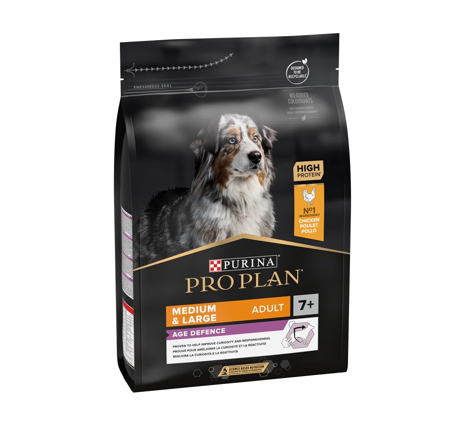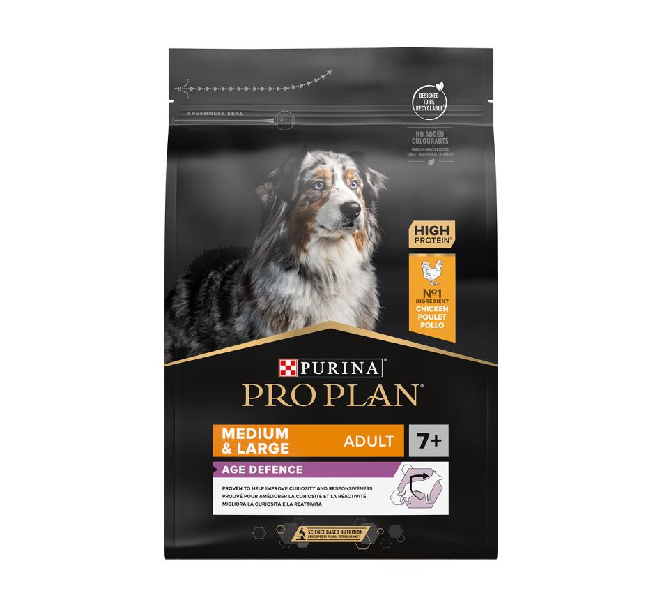Purina Pro Plan Medium & Large Adult 7+ con optiage es un alimento seco completo para perros que apoya la función cerebral en perros mayores de 7 años.