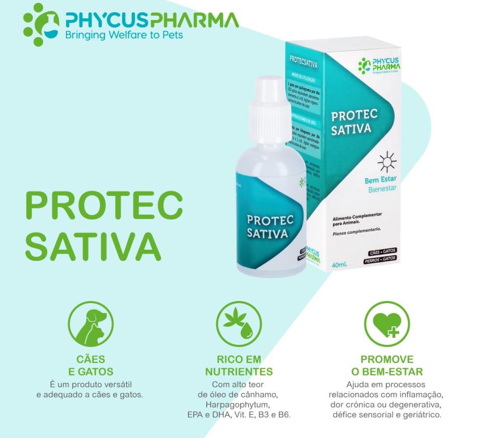 Protecsativa es un producto para perros y gatos, con un alto contenido en aceite de cáñamo (cannabis sativa L), Harpagophytum, EPA y DHA, Vit. E, B3 y B6.