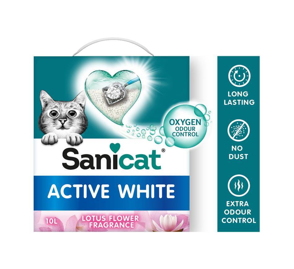 Sanicat Active White Flor Loto es una arena ultraaglomerante para gatos que elimina los malos olores de forma natural y eficaz, proporcionando una higiene superior en el hogar. Está compuesta de bentonita blanca, que absorbe la orina rápidamente y forma grumos duros que se retiran fácilmente de la caja de arena.