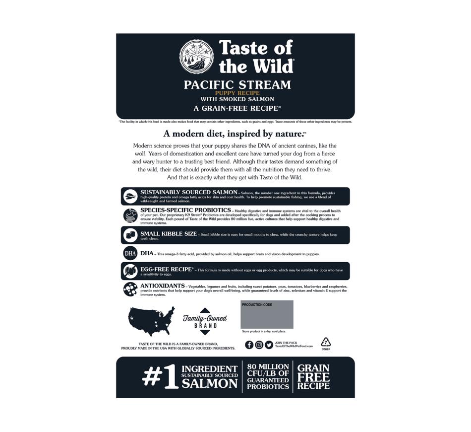 Taste of the wild pacific stream puppy salmon tiene sabores exclusivos de salmón ahumado, vegetales y frutas combinados en un tamaño de grano pequeño y a la vez crujiente, estimulan y facilitan la ingesta para que los cachorros disfruten de los nutrientes que necesitan para su crecimiento, desarrollo y general vitalidad.