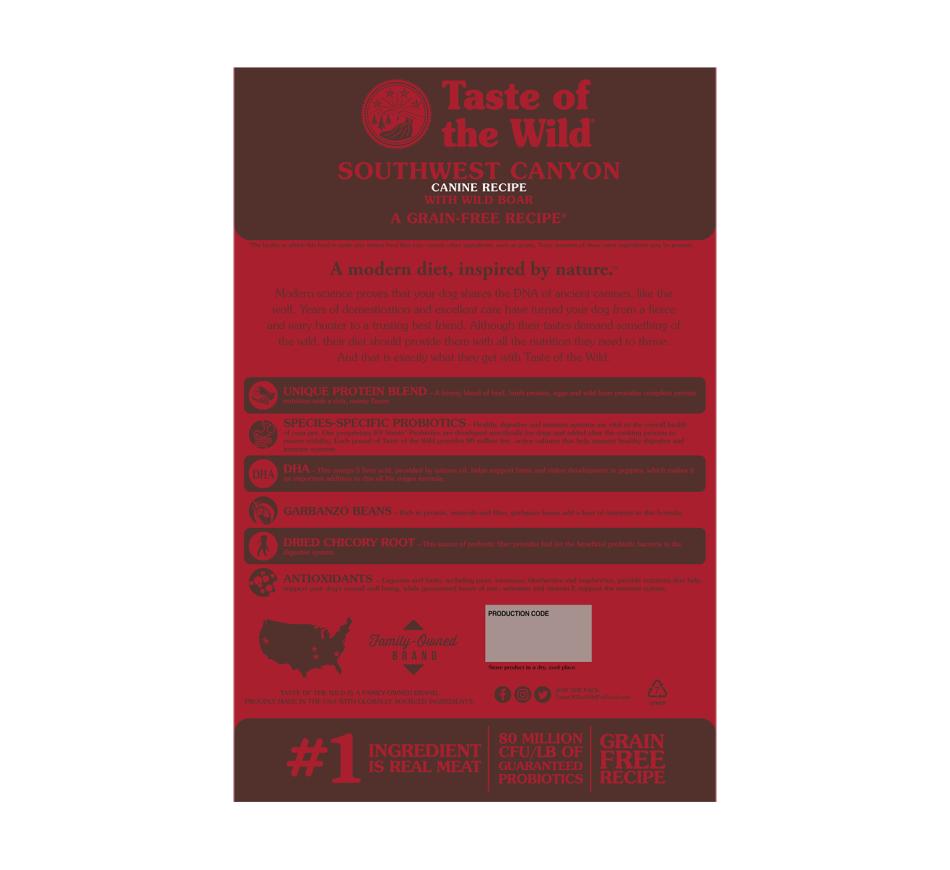 Taste of the Wild Southwest Canyon Adult es un alimento equilibrado y sabroso para todas las razas de perros, sea cual sea su tamaño o peso. La receta está inspirada en las necesidades alimenticias naturales de los perros y ofrece un alto porcentaje de proteínas importantes.