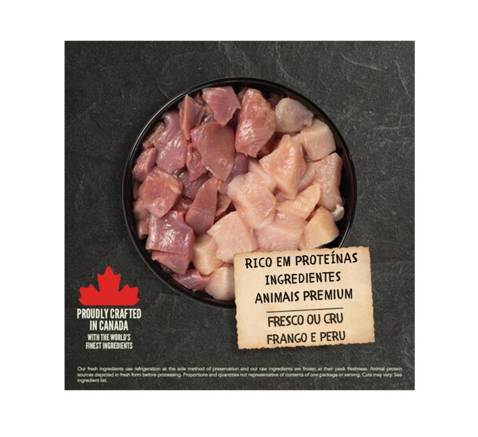 Acana Prairie Poultry inclui frango e peru criados ao ar livre e ovos de capoeira, entregues frescos ou crus diariamente em rácios Wholeprey™, a partir de quintas locais.