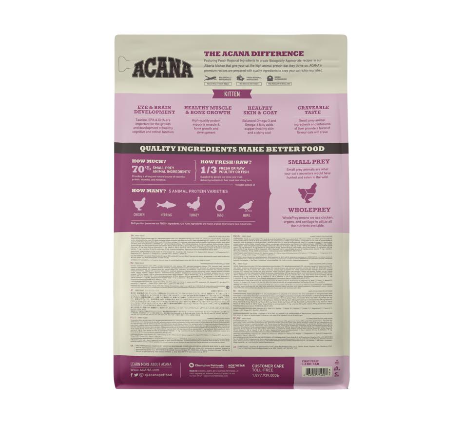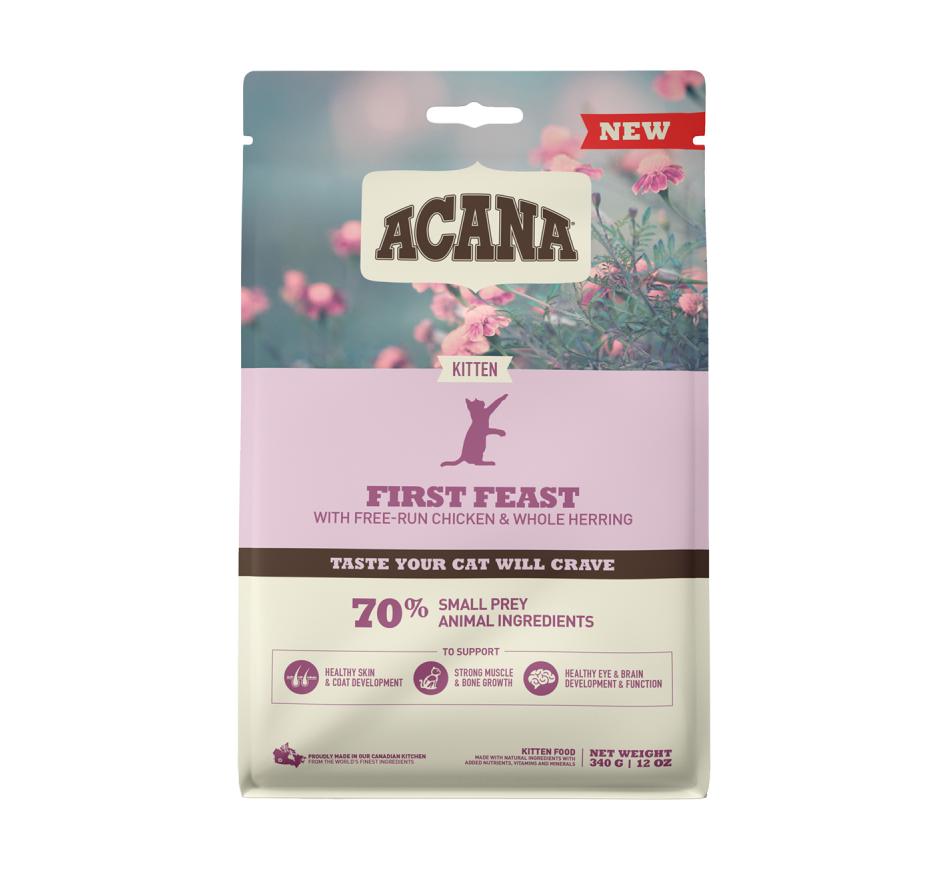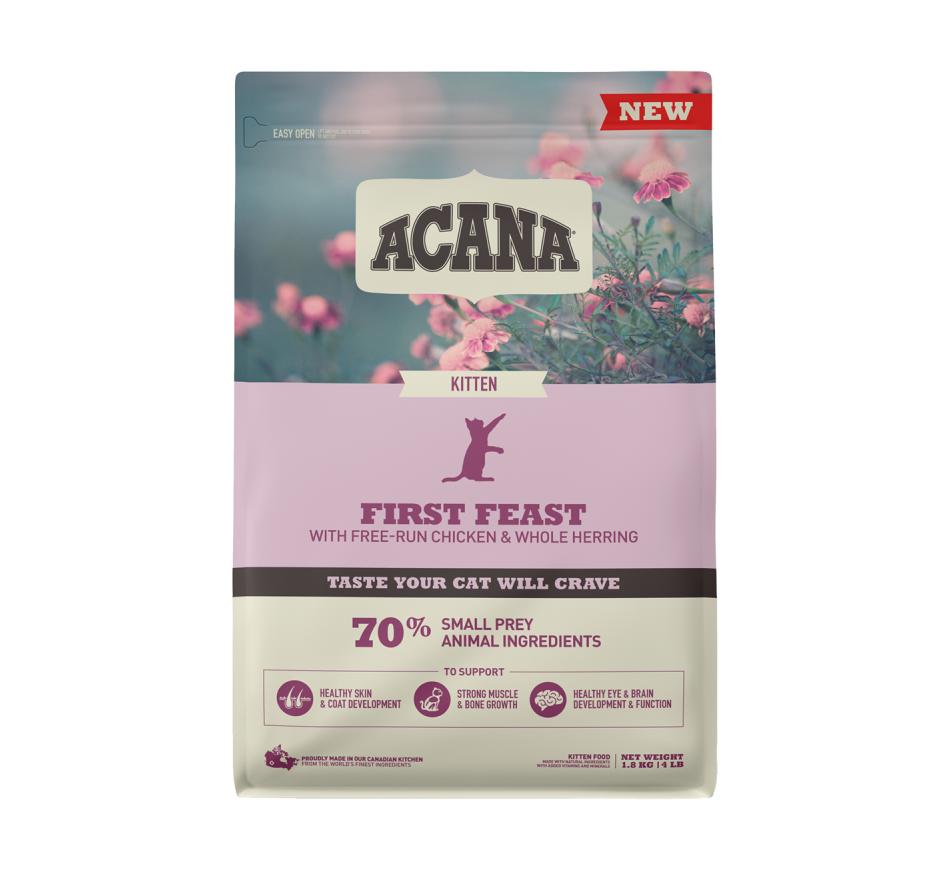 Concebido para fornecer tudo o que o seu gatinho precisa para o pico de crescimento e desenvolvimento, o Acana First Feast está repleto de frango e arenque inteiro em proporções WholePrey de carne, órgãos, cartilagem e osso, fornecendo ao seu gatinho tudo que ele precisa para crescer saudável, alegre e forte, com um sabor delicioso que eles vão adorar.
