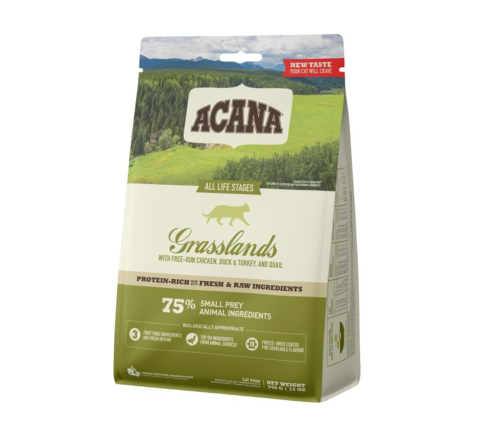 Acana Grasslands Cat é repleta de carnes de animais alimentados em pastagens, pato criado ao ar livre, ovos de capoeira e peixe de água doce, entregues frescos ou crus em rácios WholePrey™.