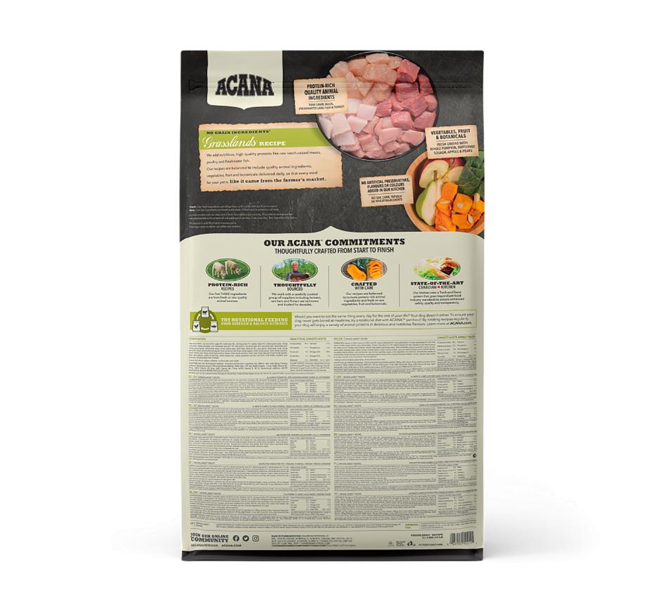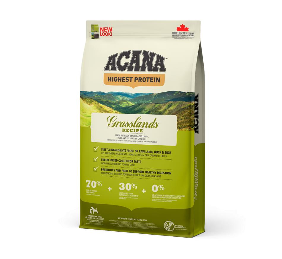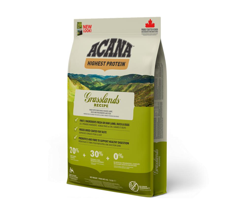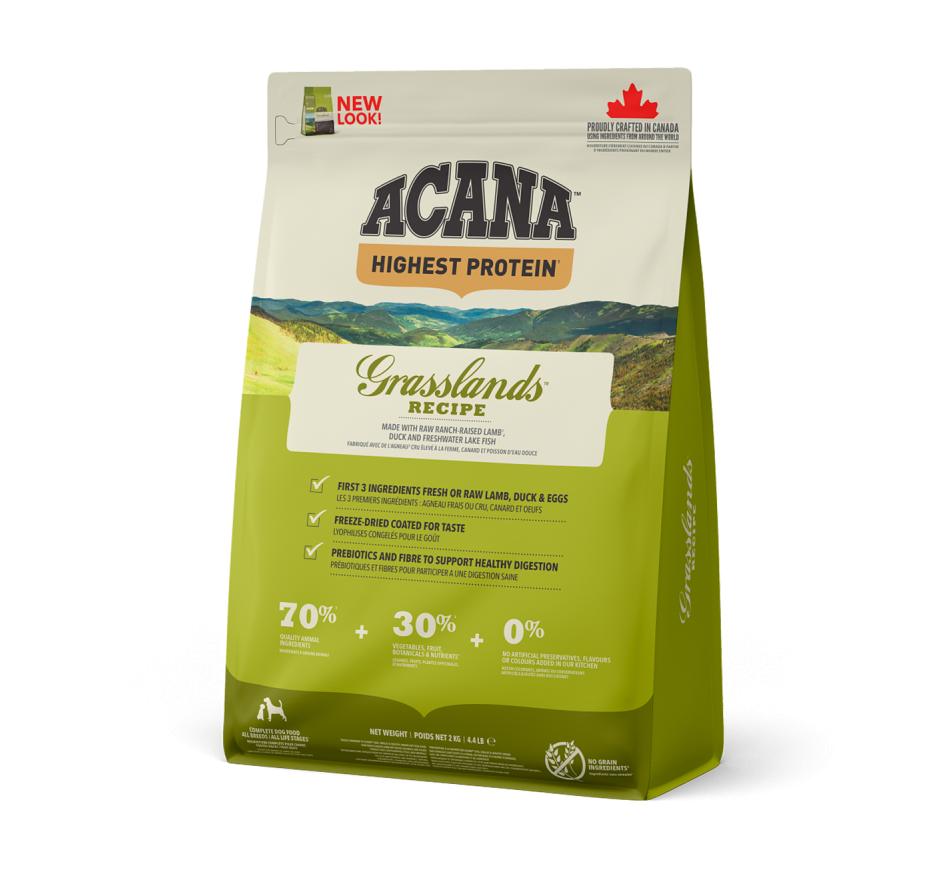 Repleta de carnes de animais alimentados em pastagens, pato criado ao ar livre, ovos de capoeira e peixe de água doce, entregues frescos ou crus em rácios WholePrey™, Acana Highest Protein Grasslands Recipe alimenta o seu cão naturalmente, sem uma longa lista de aditivos. Com teor reduzido de hidratos de carbono e repleta de proteínas da carne, Acana promove as condições físicas ideais, em todos os cães.