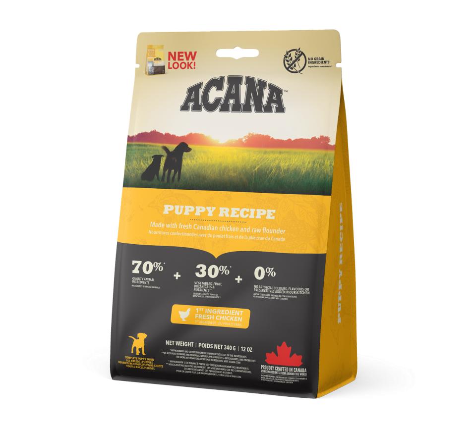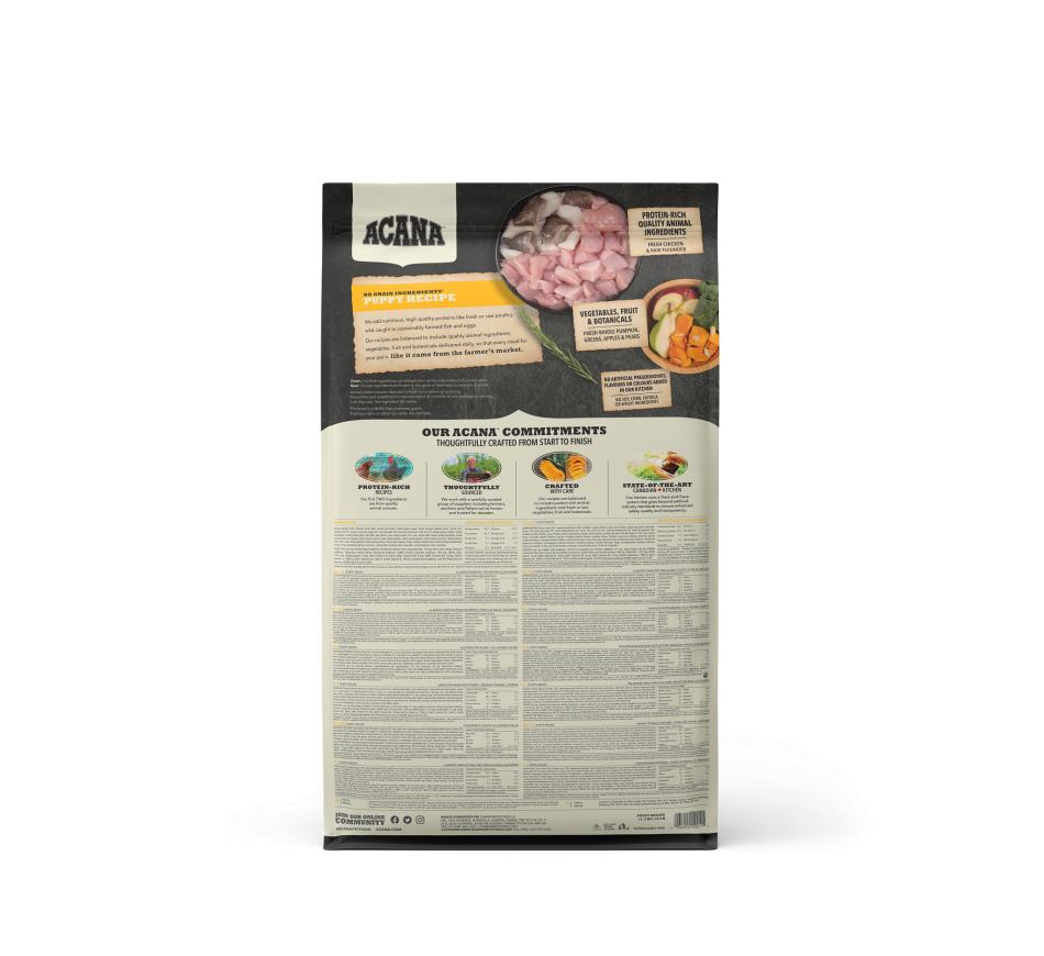 Acana Puppy Recipe está indicado para cachorros cujo peso em adulto esteja entre os 9kg e os 25kg e é repleto de frango criado ao ar livre, ovos de capoeira, linguado selvagem e fruta e vegetais amadurecidos ao sol.