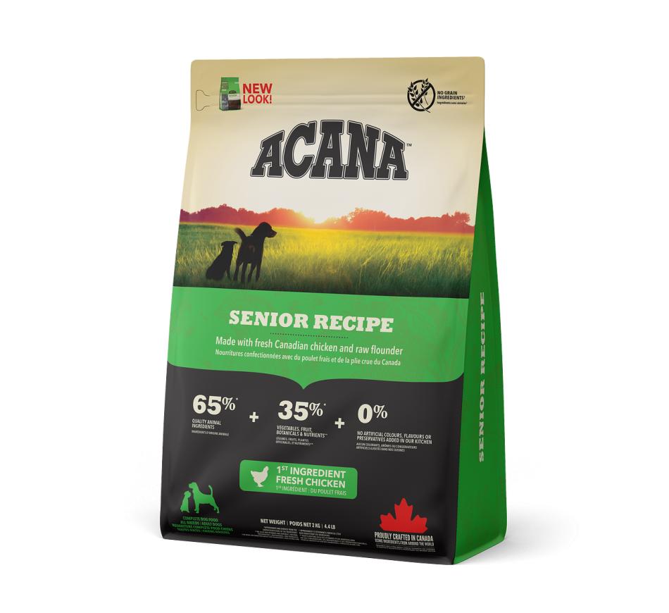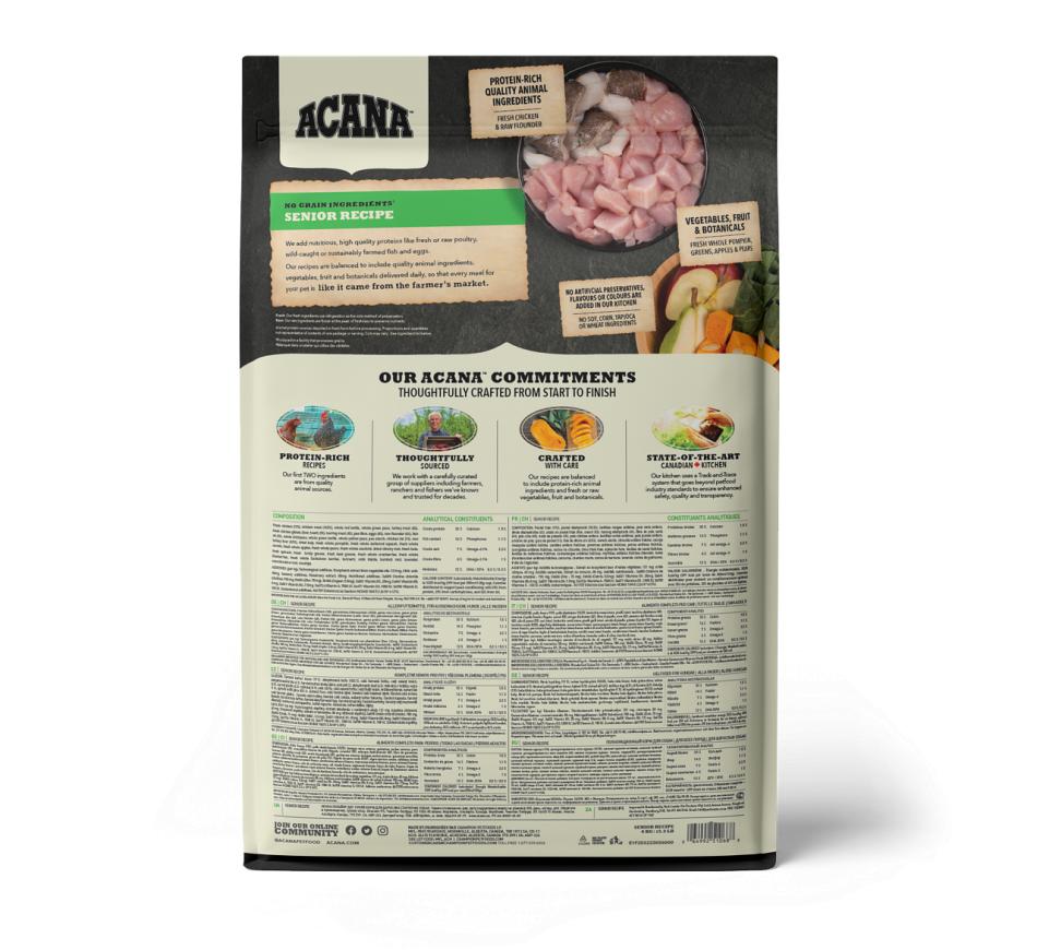 Preparado nas nossas premiadas cozinhas no Canadá, Acana Adult Senior está repleto de ingredientes locais frescos, incluindo frango criado ao ar livre, ovos de capoeira, linguado selvagem e fruta e vegetais amadurecidos ao sol. Alimento cheio de sabor com baixo teor em hidratos de carbono e calorias, que promove as melhores condições para cães seniores.