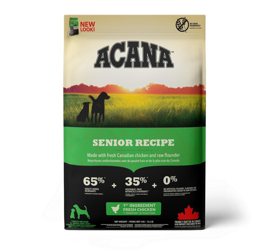 Acana Adult Senior está indicado para todos os cães adultos a partir dos 7 anos e está repleto de ingredientes locais frescos, incluindo frango criado ao ar livre, ovos de capoeira, linguado selvagem e fruta e vegetais amadurecidos ao sol.