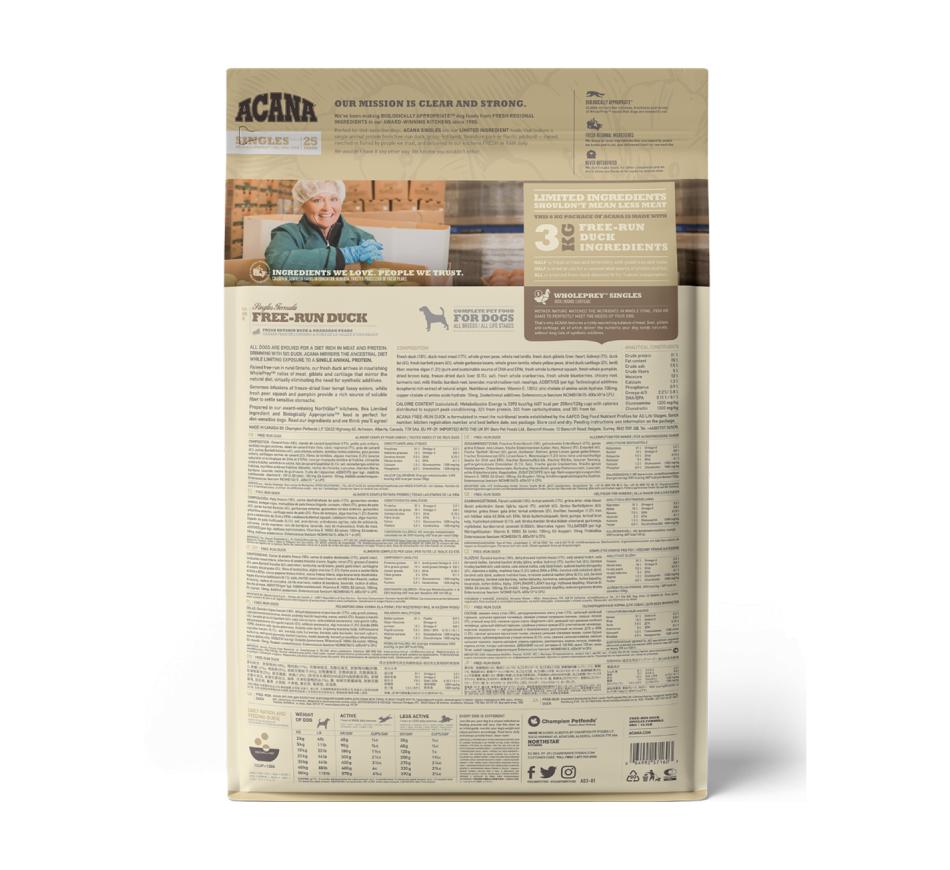 Acana Free-Run Duck com ingredientes limitados está repleto de 50% de pato criado ao ar livre que chega fresco em nutritivos rácio wholeprey. Ideal para cães com estômagos sensíveis.