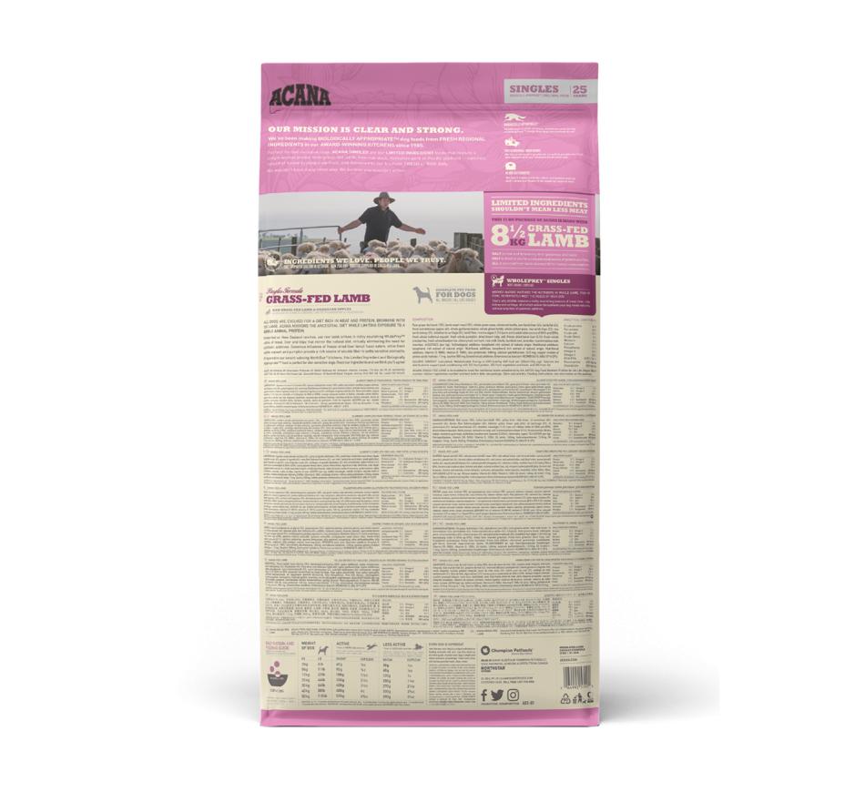 Acana Singles Grass - Fed Lamb contém 4 alimentos ricamente nutritivos com proteína única para cães com sensibilidade alimentar.