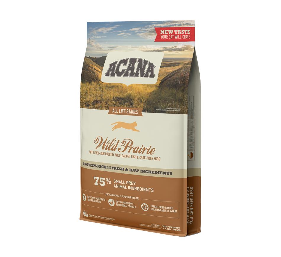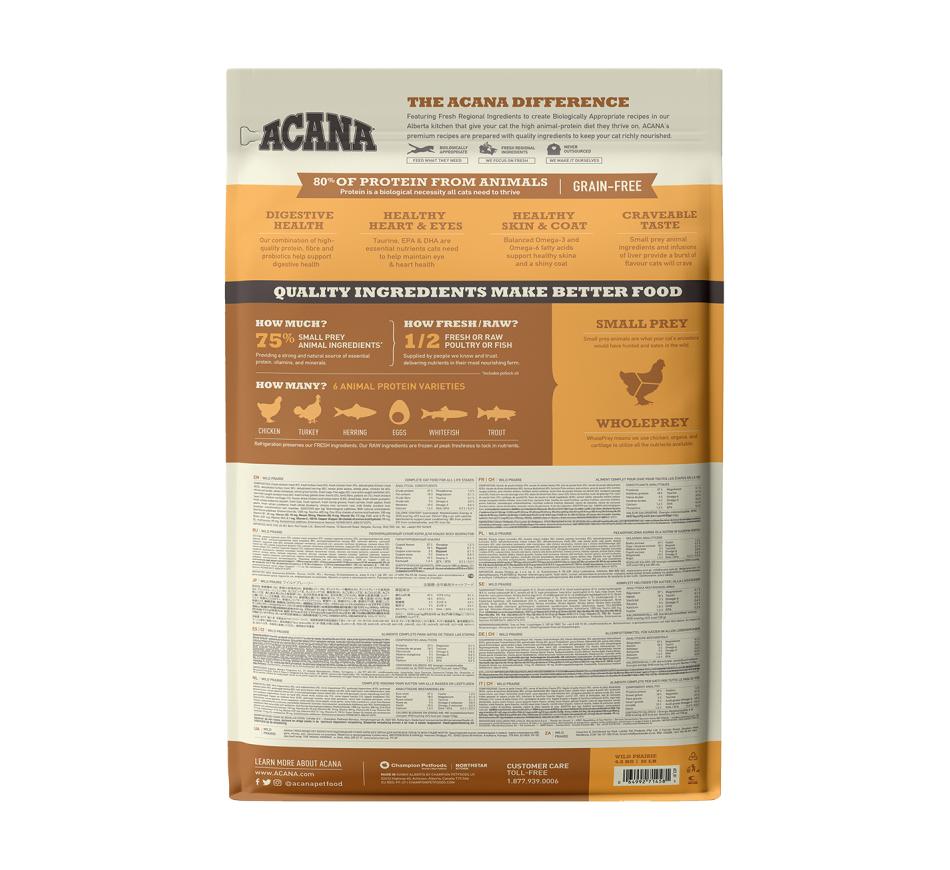 Acana Wild Praire Cat é repleto com frango criado ao ar livre, peru, ovos inteiros e peixe de captura selvagem, entregues frescos ou crus da nossa região em rácios WholePrey™.