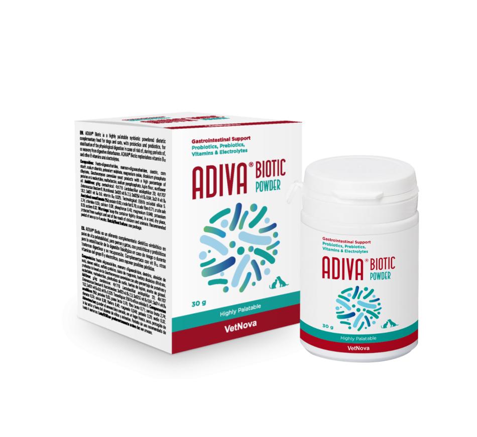 Adiva® Biotic é um alimento complementar dietético de alta palatabilidade com probióticos, prebióticos (FOS e MOS), eletrólitos e vitaminas do grupo B, desenvolvido como suporte para o normal funcionamento intestinal em cães e gatos.