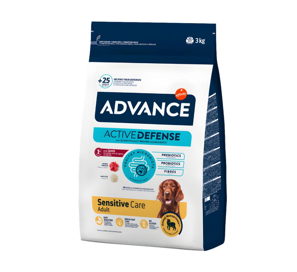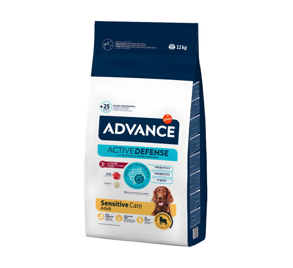 Advance Adult Sensitive Lamb & Rice é um alimento de gama alta especialmente indicado para cães adultos de todas as raças e para um especial cuidado da pele e do pelo.