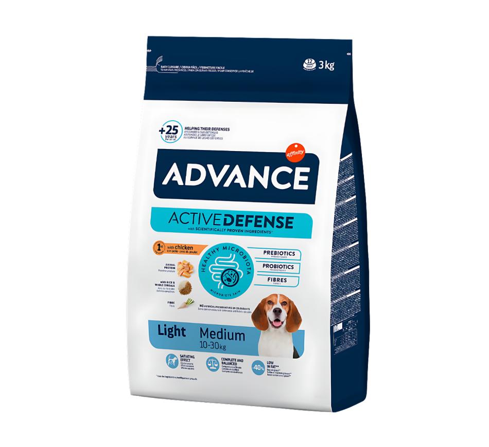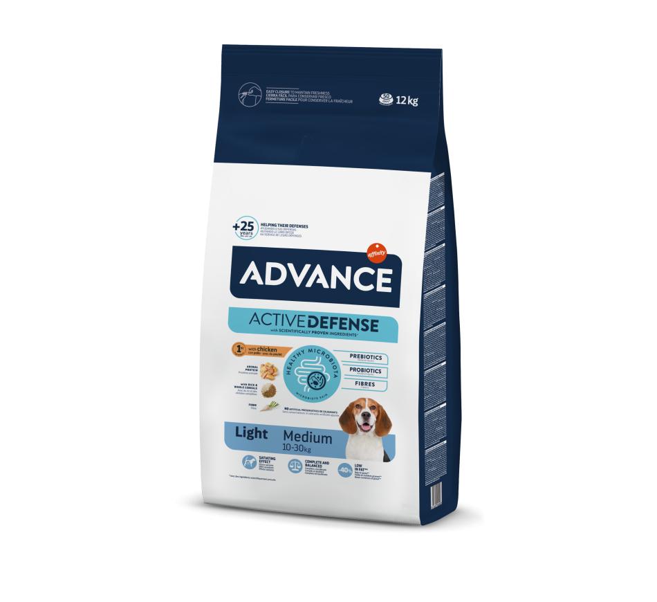 Advance Medium Light Chicken & Rice é um alimento de gama alta especialmente indicado para cães de raça média (com 10 a 30 kg de peso adulto) com excesso de peso ou que tenham tendência para a obesidade que contém: