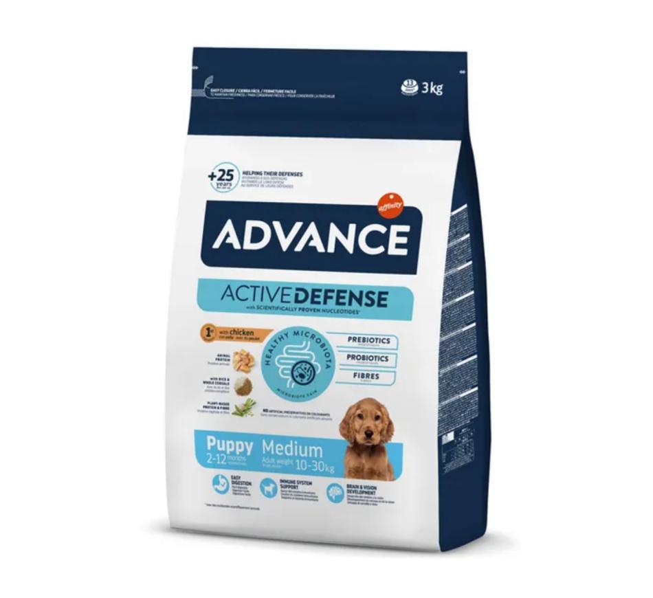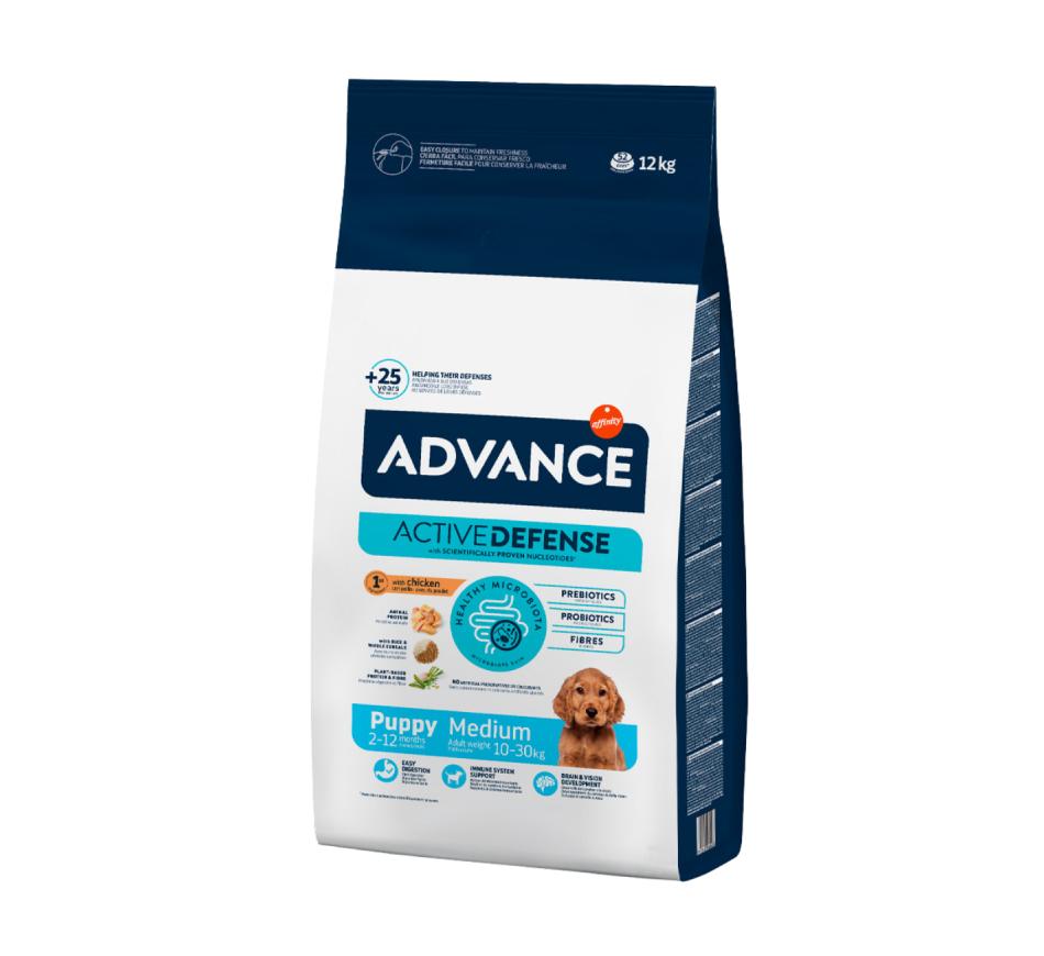 Advance Puppy Protect Medium Chicken & Rice é um alimento de gama alta especialmente indicado para cachorros (entre 2 e 12 meses) de raça média (com 10 a 30 kg de peso adulto) e fêmeas gestantes ou lactantes que contém: