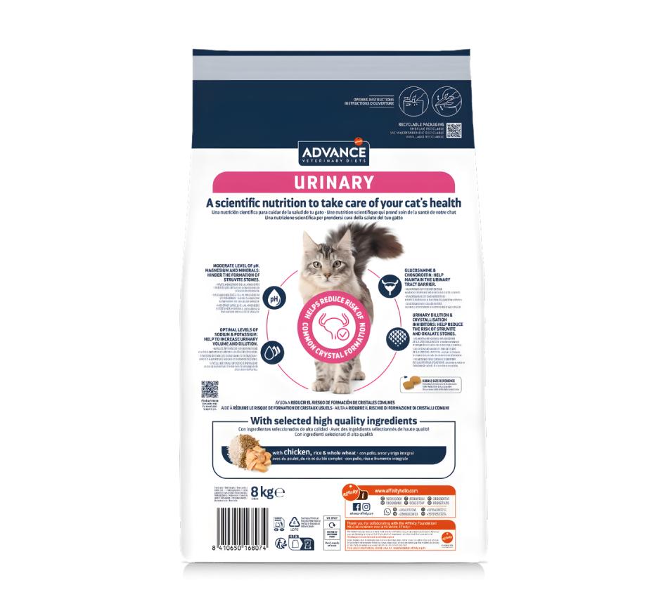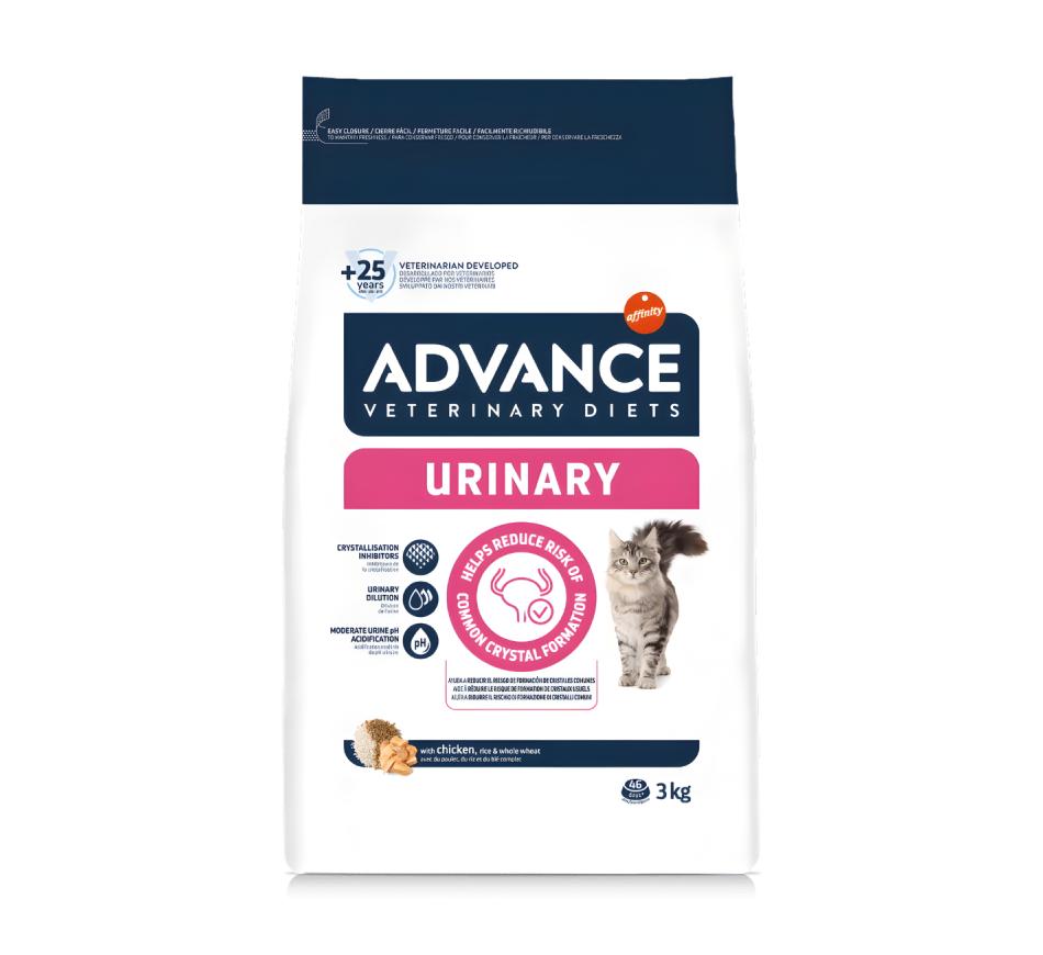 Advance Cat Veterinary Diets Urinary é um alimento dietético completo para gatos, formulado para o tratamento das doenças das vias urinárias dos felinos e para a redução dos cálculos de fosfato inorgânico(estruvite), que acidifica a urina e proporciona um nível reduzido de magnésio.
