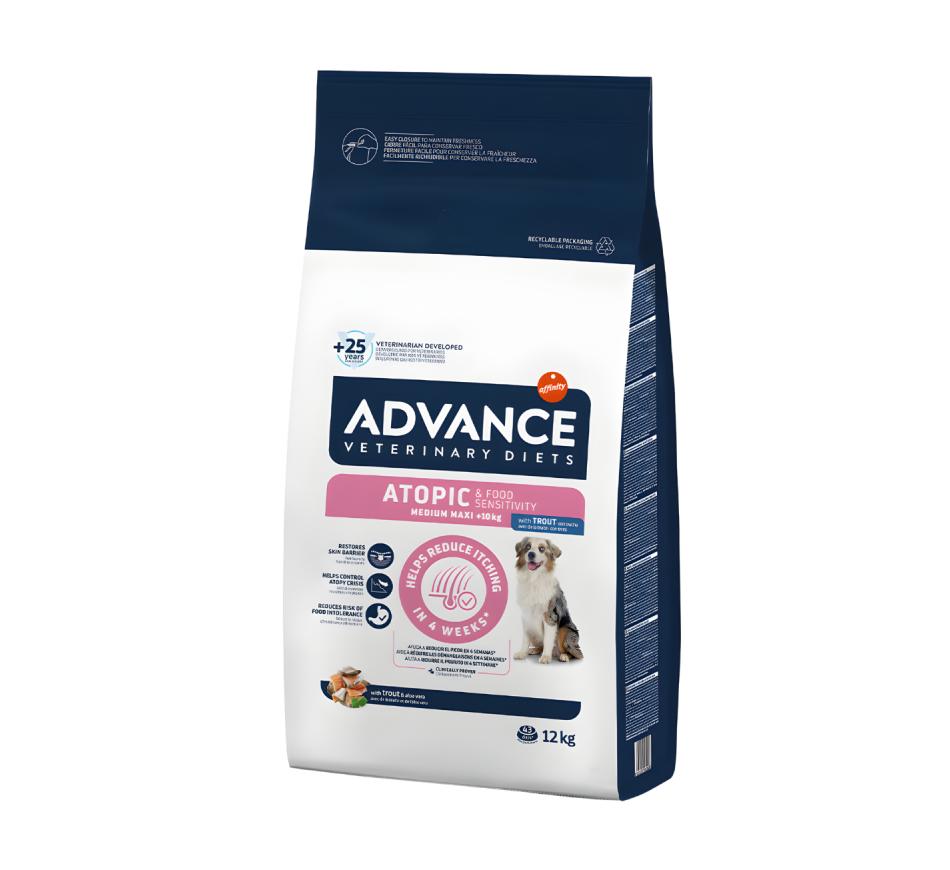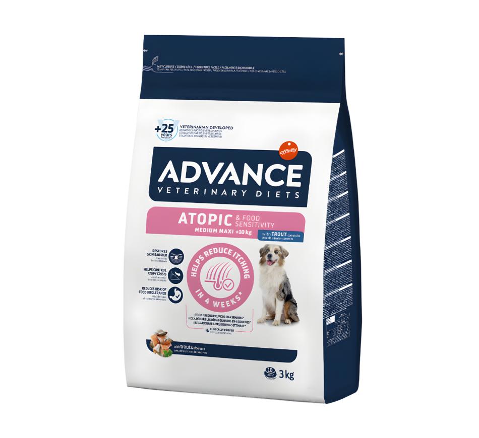 O alimento ADVANCE VETERINARY DIETS Atopic Medium/Maxi contém croquetes especificamente adaptados ao tamanho e às necessidades do seu cão de porte médio/grande (>10 kg).