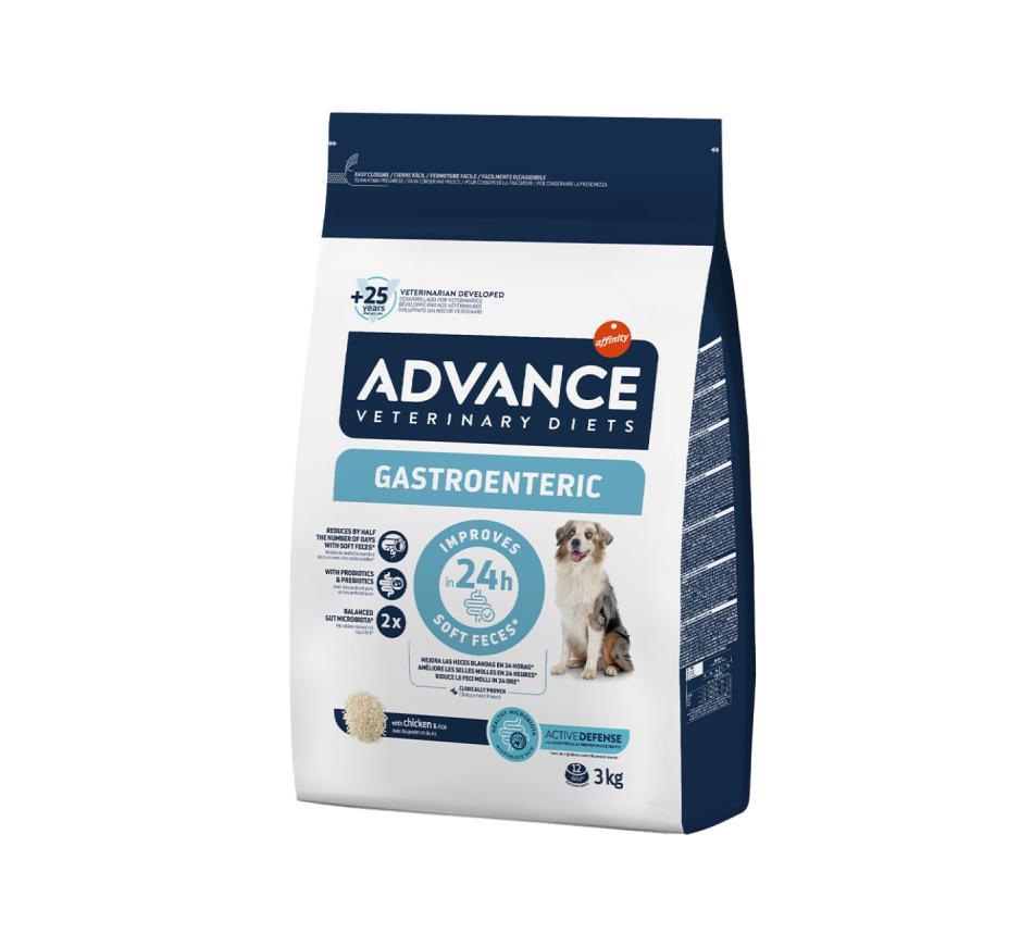 ADVANCE VETERINARY DIETS Gastroenteric é um alimento dietético completo para cachorros e cães adultos, elaborado com ingredientes muito digeríveis, um teor baixo de gordura e uma maior proporção de sódio e potássio, para ajudar a reduzir determinadas alterações gastrointestinais e para casos de insuficiência pancreática exócrina.