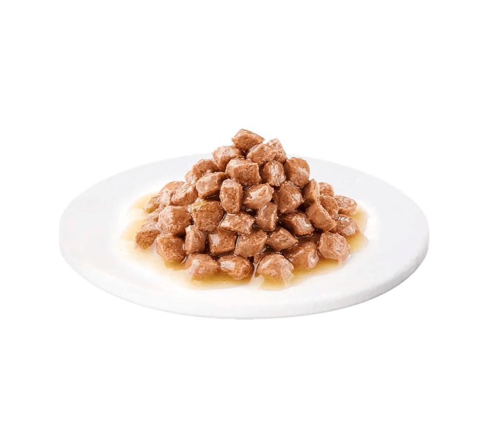 Alimento húmido, completo e balanceado em pedaços em molho com frango formulado especificamente para gatos adulto +12meses.