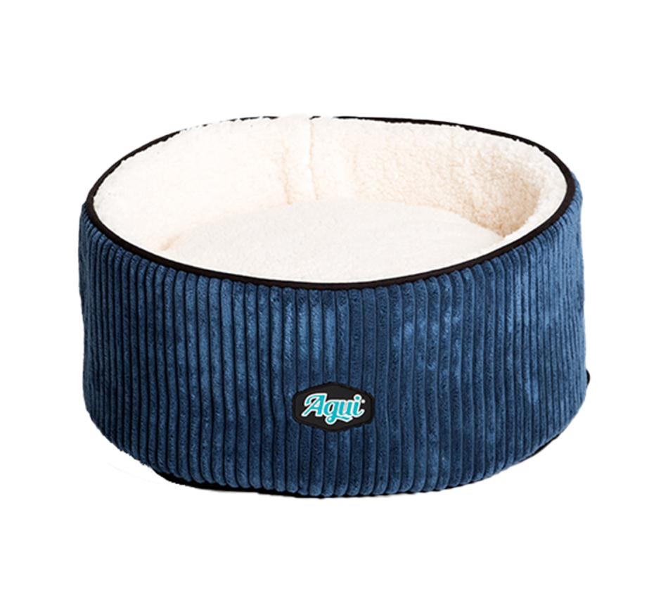 Cama redonda revestida em veludo macio em padrão canelado vertical contrastando com o revestimento interior macio em lã sintética.