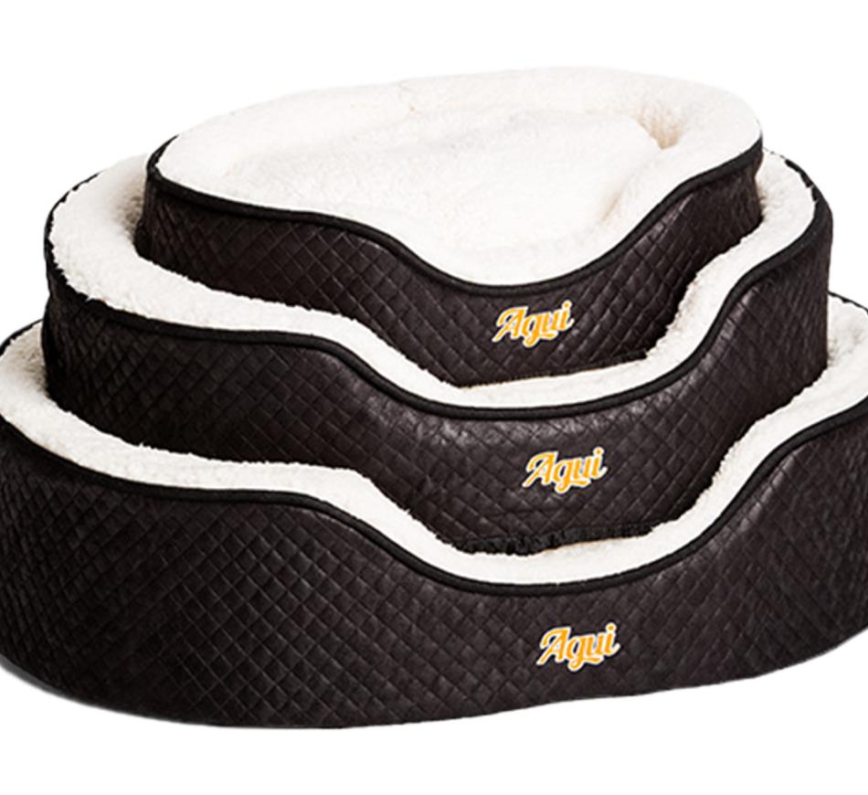 Agui Cama oval Diamond é revestida a pele preta sintética costurada em padrão diamante em contraste com o revestimento interior em lã sintética.