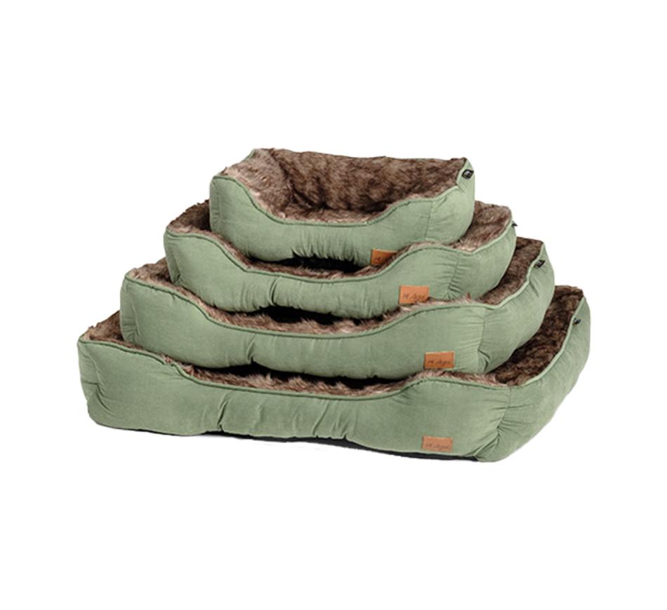 Cama produzida em tecido suave com logotipo em pele. Interior revestido com pelo suave e longo. Enchimento interior em fibra 100% reciclada.