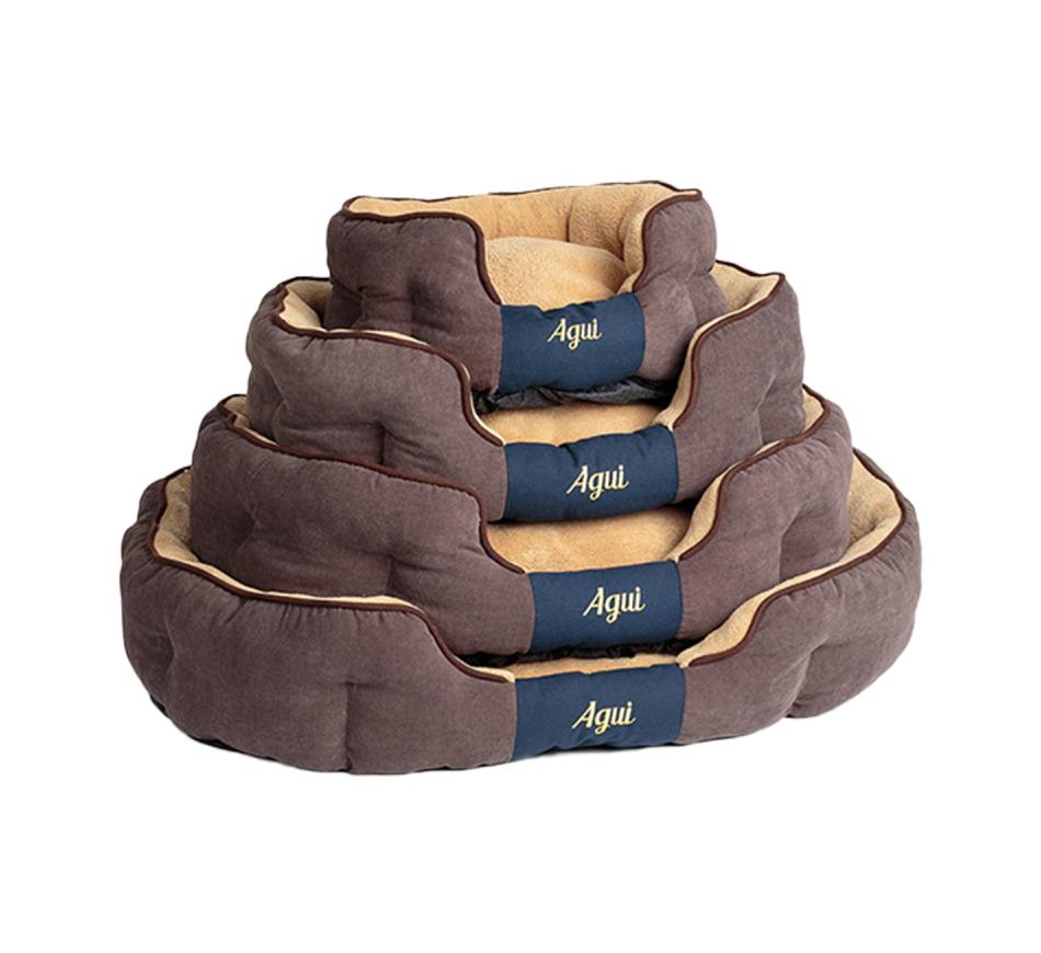Cama oval castanho aproduzida usando no exterior tecido texturado em cores sóbrias com interior coberto de pelo suave e logotipo bordado.