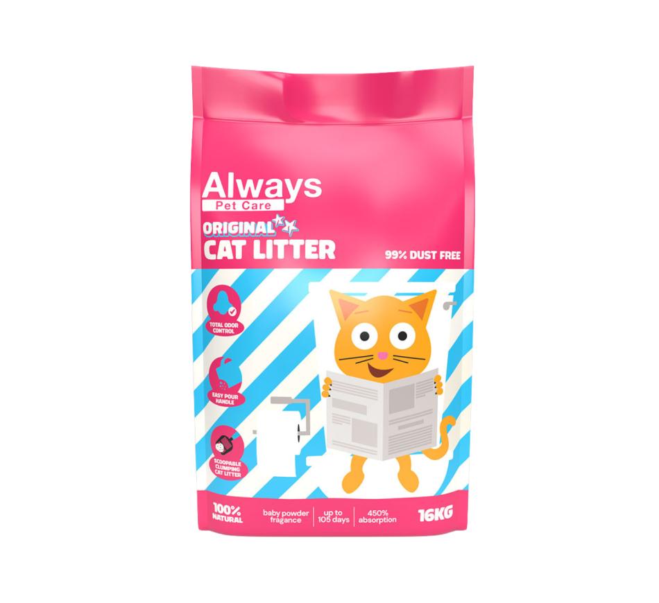 Always Cat Litter é uma Super premium Cat Litter, areia aglomerante com 450% absorção,100% natural. Fragrância Pó de talco de bébé.