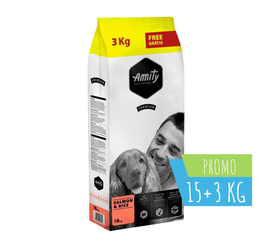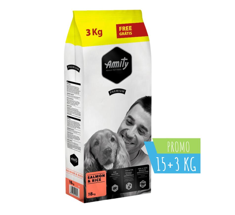 Amity premium salmon & rice é uma ração para cães adultos composta à base de salmão e arroz, enriquecida com prebióticos, ómega 3e ómega 6. Sem glúten e com altos índices de digestibilidade e de palatabilidade. Potencia uma pelagem brilhante e saudável.