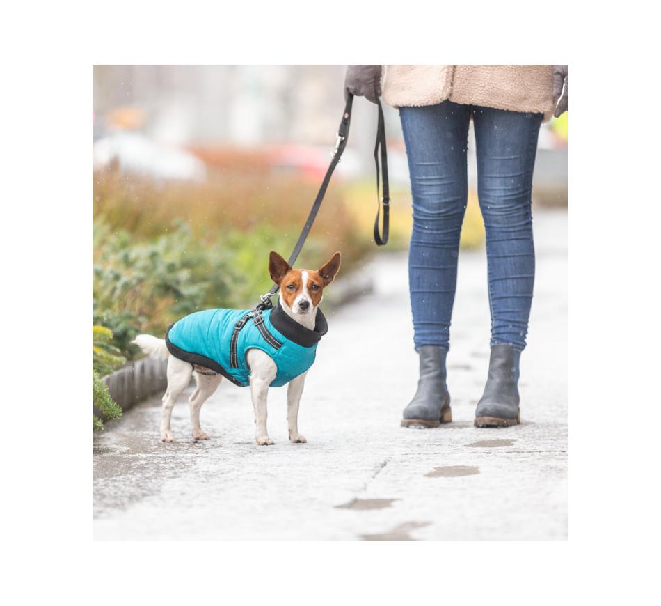 Capa Pontis Verde àgua para a chuva e o frio, com peitoral já incorporado, para facilitar o uso de trela, indicado para cães pequenos e médios.