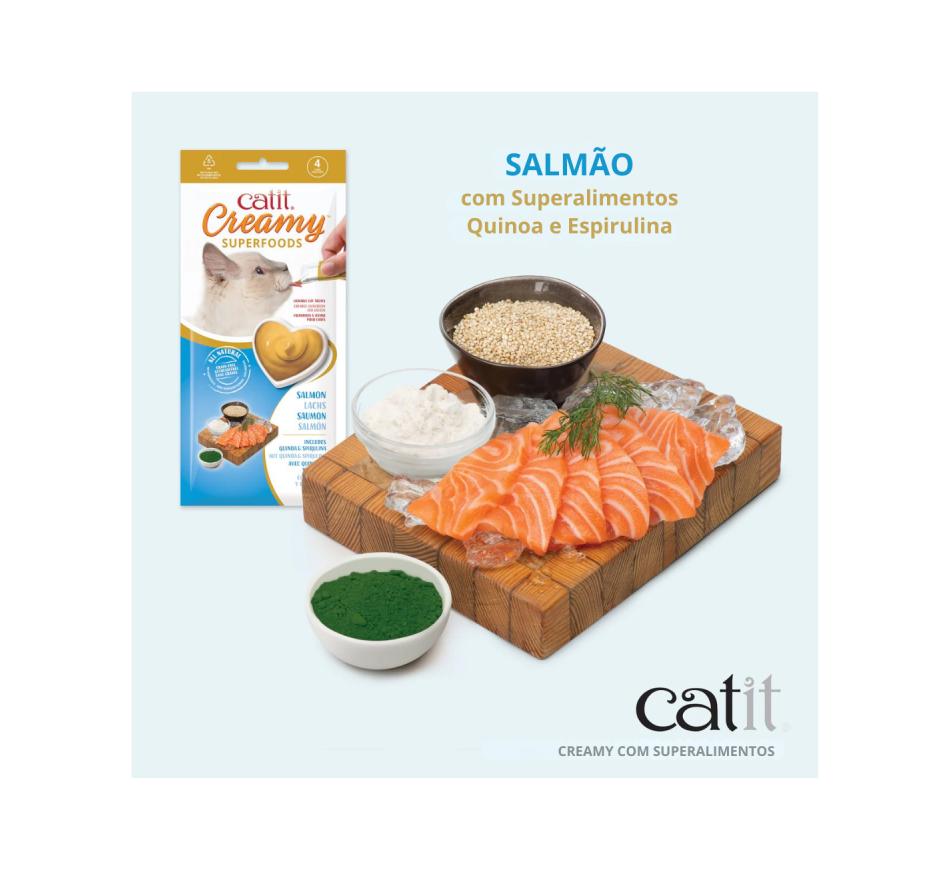Alimento complementar, snack cremoso, com salmão, enriquecido com superalimentos, quinoa e spirulina. Deliciosos e saudáveis para mimar o seu gato.