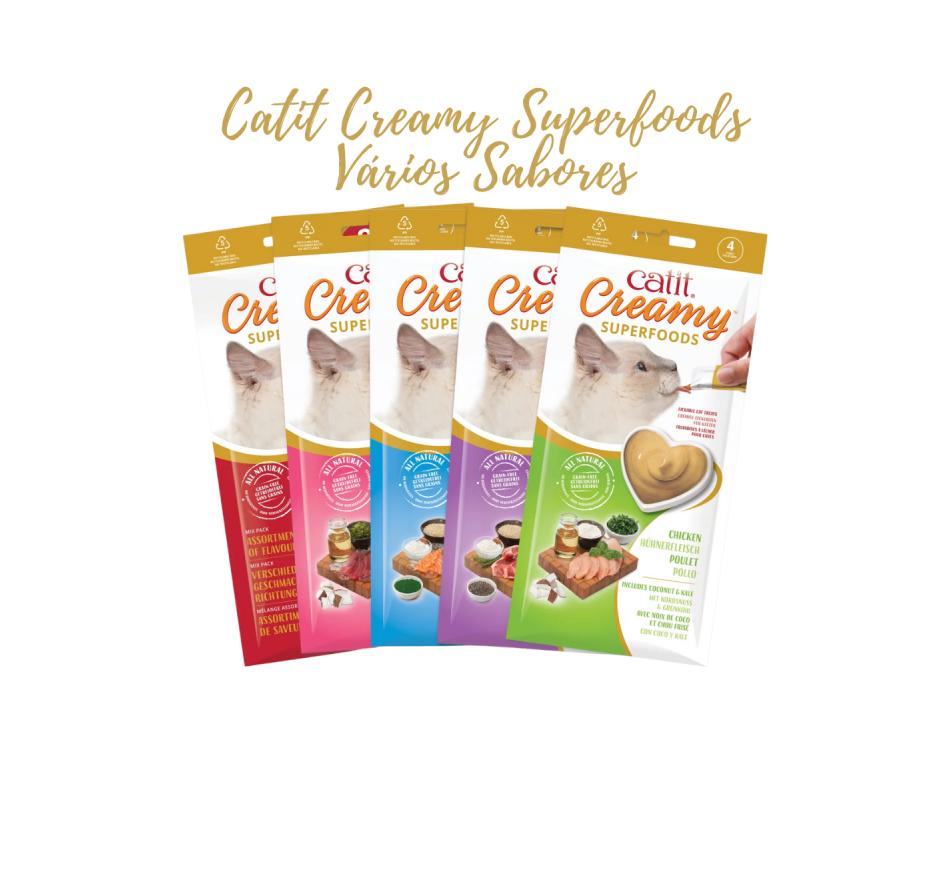 – Cada embalagem contém 4 tubos de Catit Cremoso com Superalimentos.
