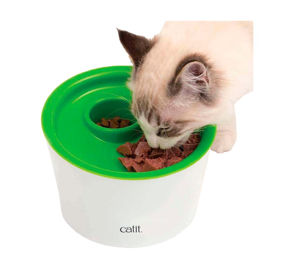 O Catit Multi Feeder estimula os gatos a diminuir o ritmo de comer, o que ajuda a evitar a compulsão alimentar.