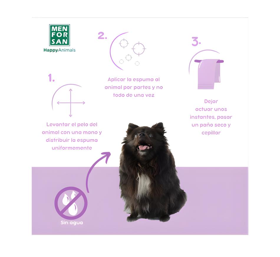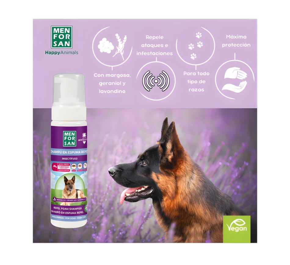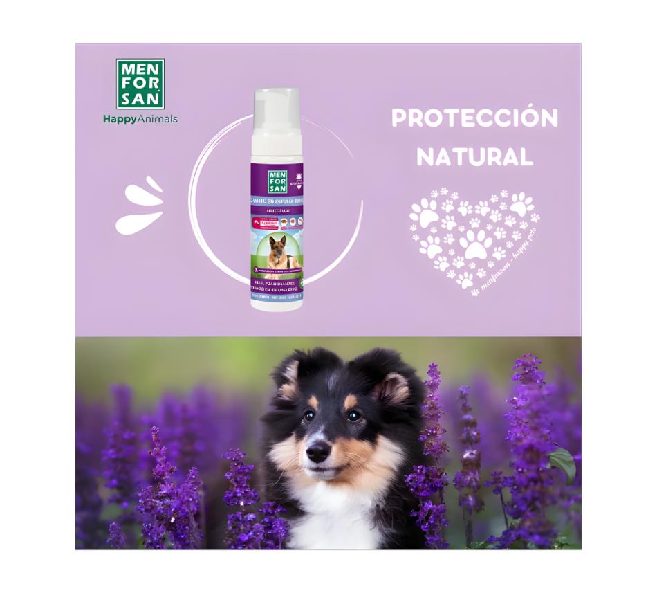 Champô em Espuma Anti-Insetos para Cão - MenForSan é um Shampoo com efeito repelente de insetos em espuma, 100% natural, à base de margosa, geraniol e lavanda para a limpeza a seco do pelo dos cães.