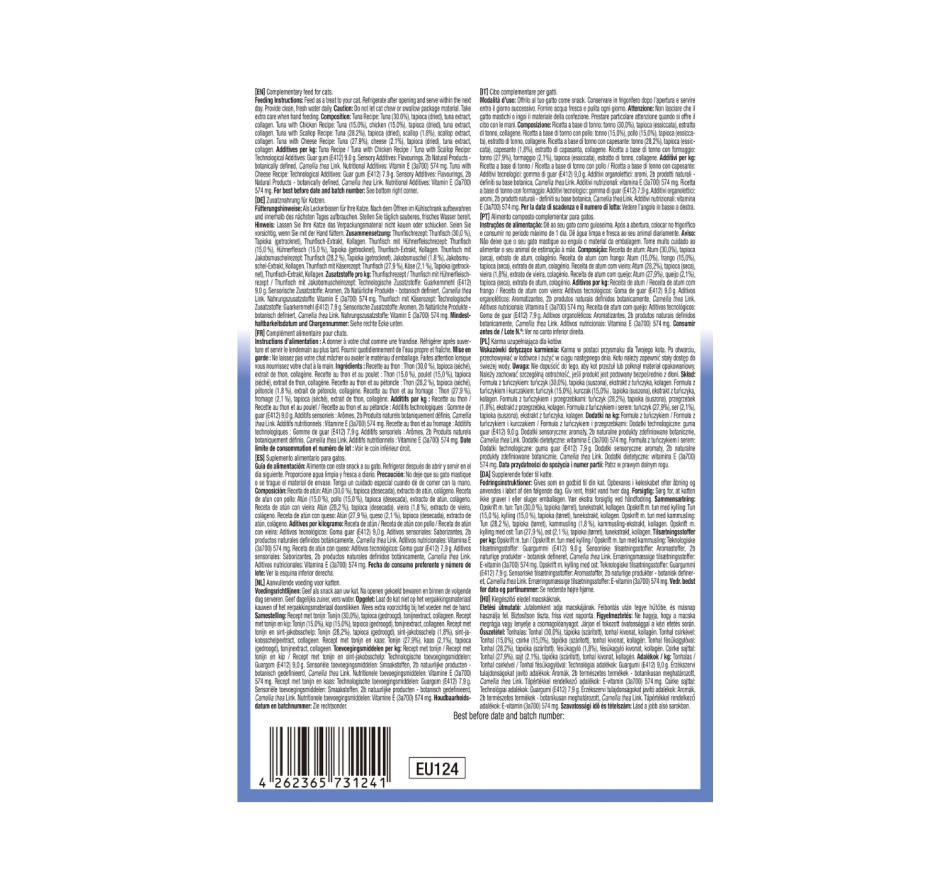 Estes deliciosos petiscos proporcionam ao seu gato uma experiência de lanche saudável e agradável. Oferece um variedade de sabores à base de atum que irão agradar até os paladares mais exigentes. A textura macia e suave torna estes petiscos fáceis de desfrutar para gatos de todas as idades e raças, incluindo gatos idosos ou aqueles com sensibilidades dentárias.