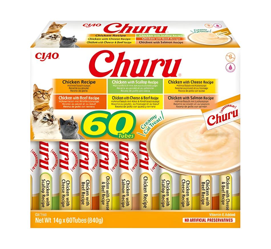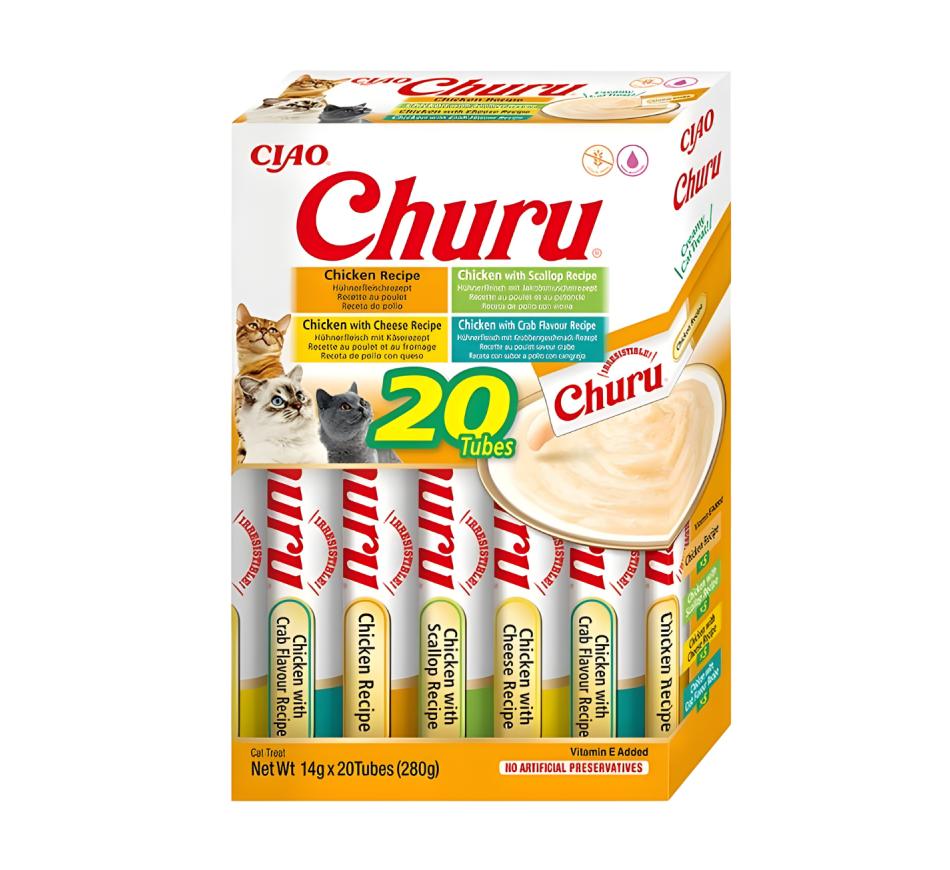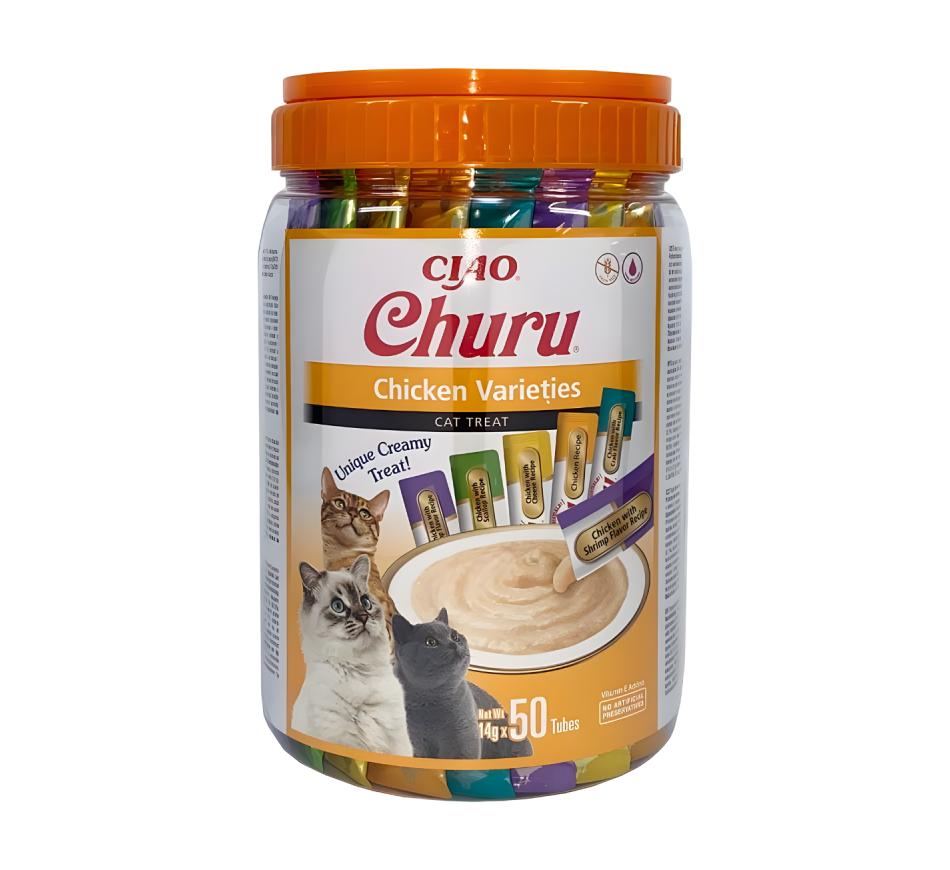 Mime seu amigo felino com o sabor irresistível dos petiscos Churu Gato Box Variedades de Frango!