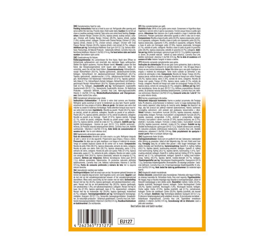 Estes deliciosos petiscos proporcionam ao seu gato uma experiência de lanche saudável e agradável. Oferece um variedade de sabores à base de frango que irão agradar até os paladares mais exigentes. A textura macia e suave torna estes petiscos fáceis de desfrutar para gatos de todas as idades e raças, incluindo gatos idosos ou aqueles com sensibilidades dentárias.