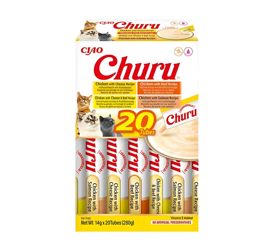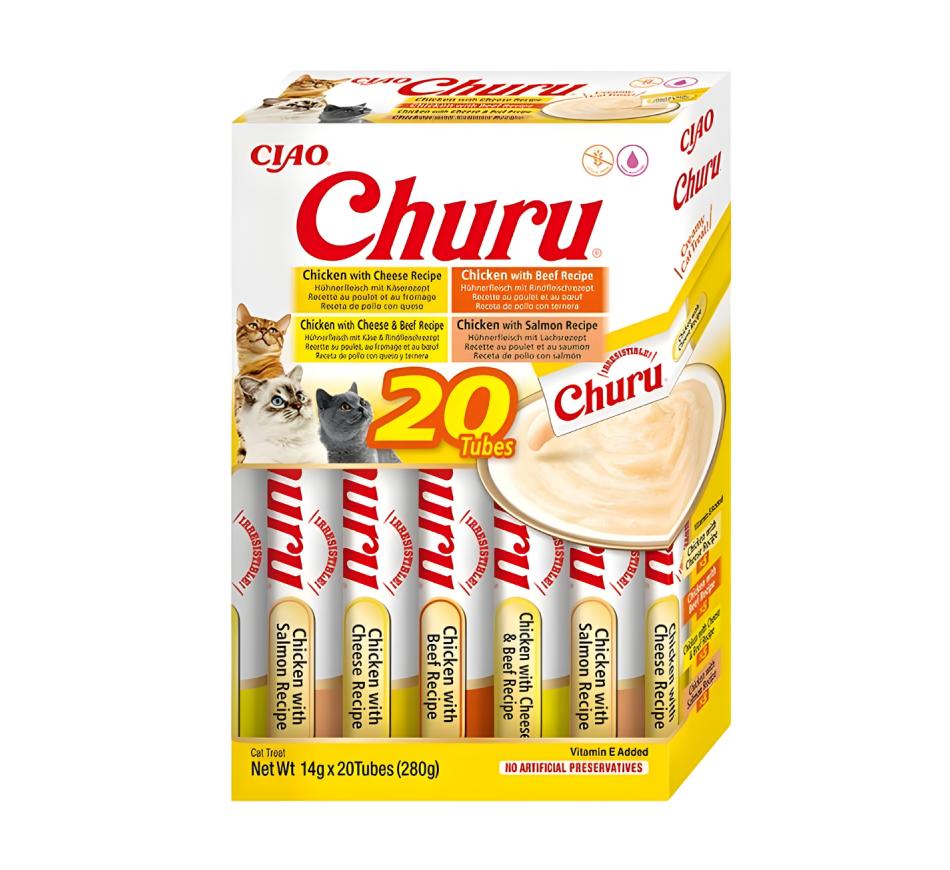 Mime seu amigo felino com o sabor irresistível dos petiscos Churu Gato Box Variedades de Frango com Vaca!