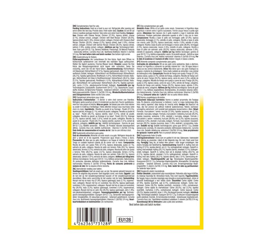 Estes deliciosos petiscos proporcionam ao seu gato uma experiência de lanche saudável e agradável. Oferece um variedade de sabores à base de frango e vaca que irão agradar até os paladares mais exigentes. A textura macia e suave torna estes petiscos fáceis de desfrutar para gatos de todas as idades e raças, incluindo gatos idosos ou aqueles com sensibilidades dentárias.