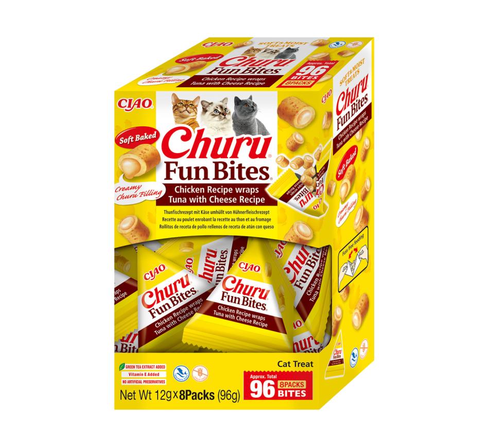 Transforme o momento do lanche do seu gato em uma experiência deliciosa e saudável com os Churu Gato Fun Bites Receita de Atum com Queijo!