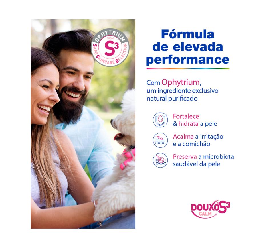 DOUXO S3 tem um novo ingrediente ativo, o Ophytrium. O Ophytrium é um ingrediente de origem natural, purificado, extraído da raíz da planta Ophiopogon japonicus. Está cientificamente comprovado que o Ophytrium tem uma ação tripla e simultânea na barreira cutânea, restabelecendo o equilíbrio da flora microbiana protetora, fortalecendo a barreira cutânea mecânica e reduzindo a irritação da pele. A nova embalagem, desenvolvida em colaboração com os tutores, garante a satisfação máxima dos clientes.