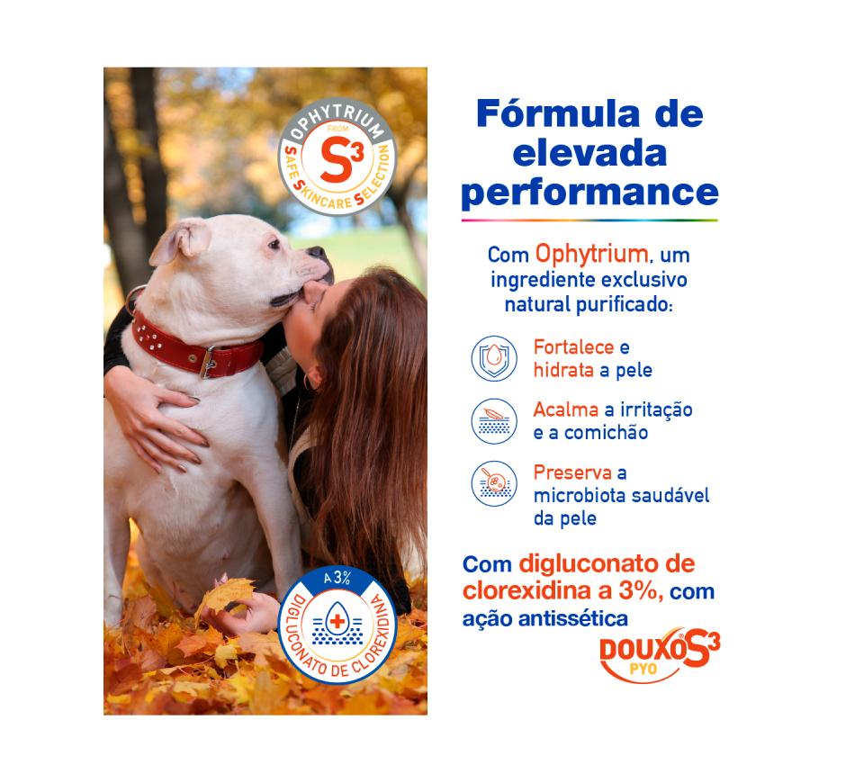 DOUXO S3 tem um novo ingrediente ativo, o Ophytrium. O Ophytrium é um ingrediente de origem natural, purificado, extraído da raíz da planta Ophiopogon japonicus. Está cientificamente comprovado que o Ophytrium tem uma ação tripla e simultânea na barreira cutânea, restabelecendo o equilíbrio da flora microbiana protetora, fortalecendo a barreira cutânea mecânica e reduzindo a irritação da pele. A nova embalagem, desenvolvida em colaboração com os tutores, garante a satisfação máxima dos clientes.