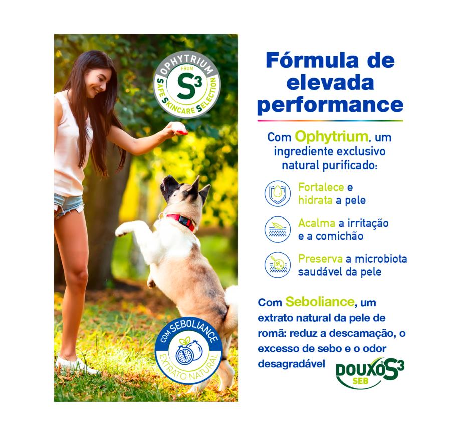 DOUXO S3 tem um novo ingrediente ativo, o Ophytrium. O Ophytrium é um ingrediente de origem natural, purificado, extraído da raíz da planta Ophiopogon japonicus. Está cientificamente comprovado que o Ophytrium tem uma ação tripla e simultânea na barreira cutânea, restabelecendo o equilíbrio da flora microbiana protetora, fortalecendo a barreira cutânea mecânica e reduzindo a irritação da pele. A nova embalagem, desenvolvida em colaboração com os tutores, garante a satisfação máxima dos clientes.