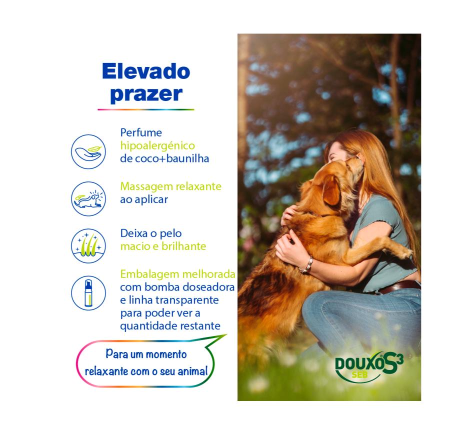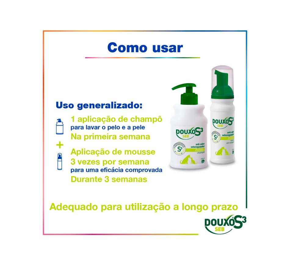 DOUXO S3 Seb champô, coadjuvante de ações de tratamento e profilaxia de todos os tipos de seborreia em cães e gatos.