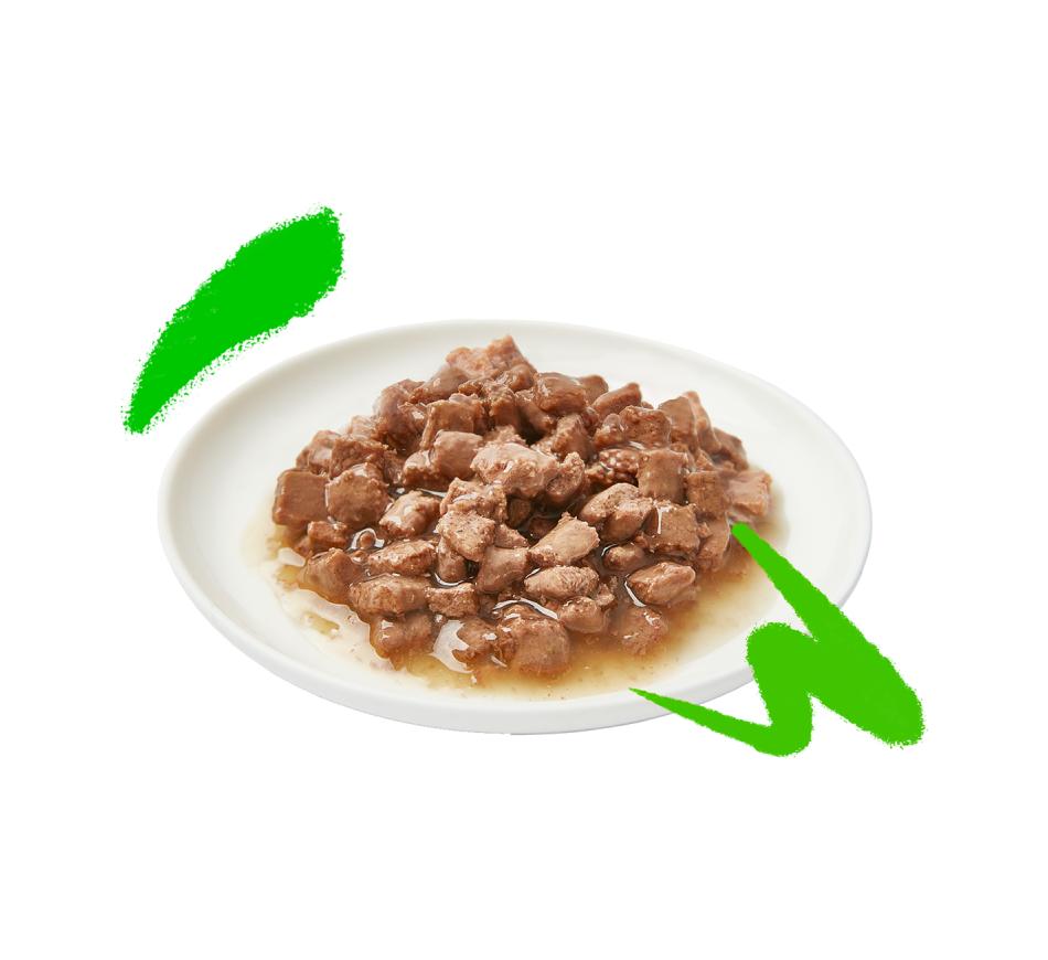 Os gatos são carnívoros naturais, por isso garantimos que as nossas receitas sejam repletas de proteínas de carne fresca e miudezas nutritivas.