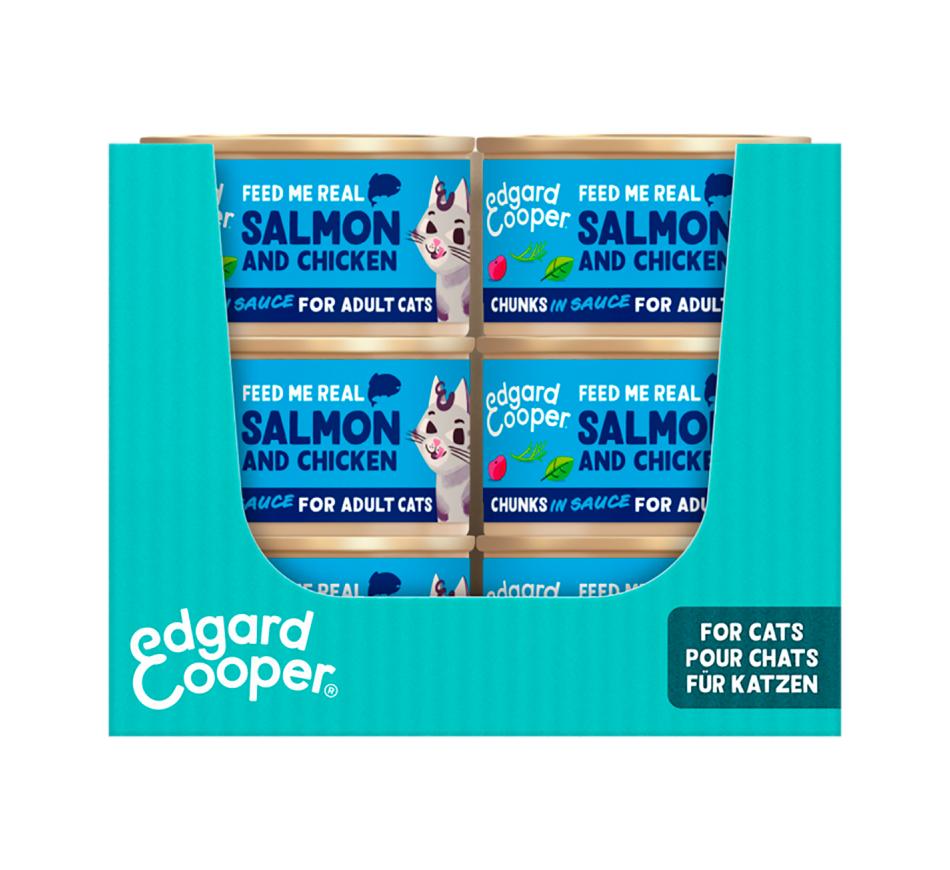 As latinhas de Chuncks de Salmão e Frango Edgard & Cooper são uma alimentação húmida completa em pedacinhos de carne num molho irresistível.