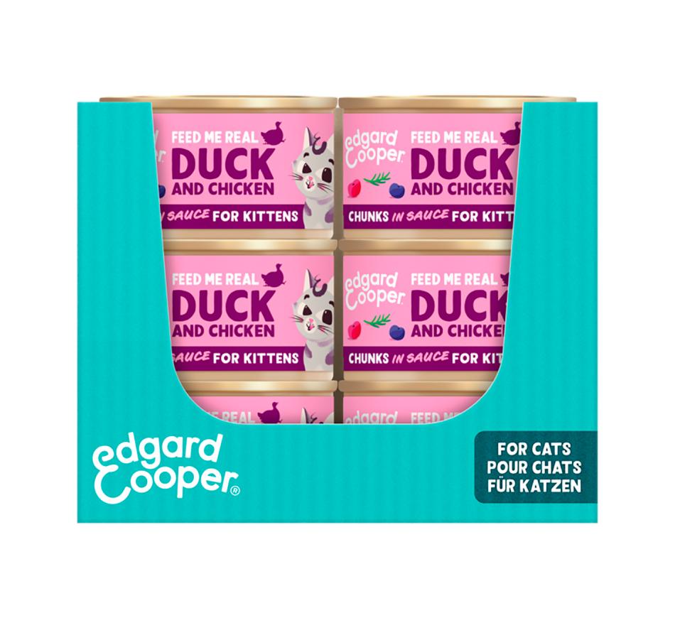 As latinhas de Chuncks de Pato e Frango Edgard & Cooper são uma alimentação húmida completa em pedacinhos de carne num molho irresistível.