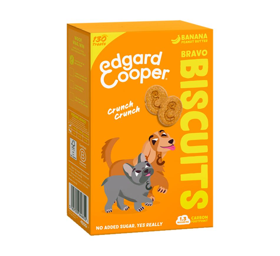Irresistíveis biscoitos crocantes Edgard & Cooper Snack Cão Crunchy Cookies Banana e manteiga amendoim para recompensar o bom comportamento ou em momentos especiais. Sem sabores artificiais e sem açúcar adicionado. Apenas o doce da fruta e dos vegetais!